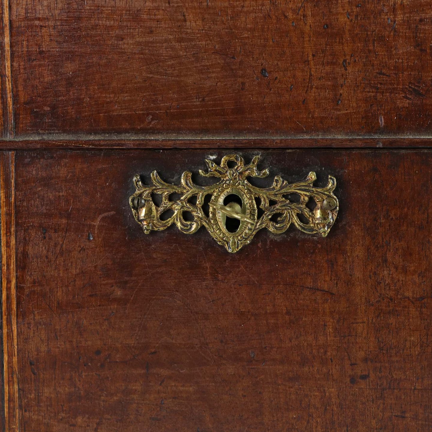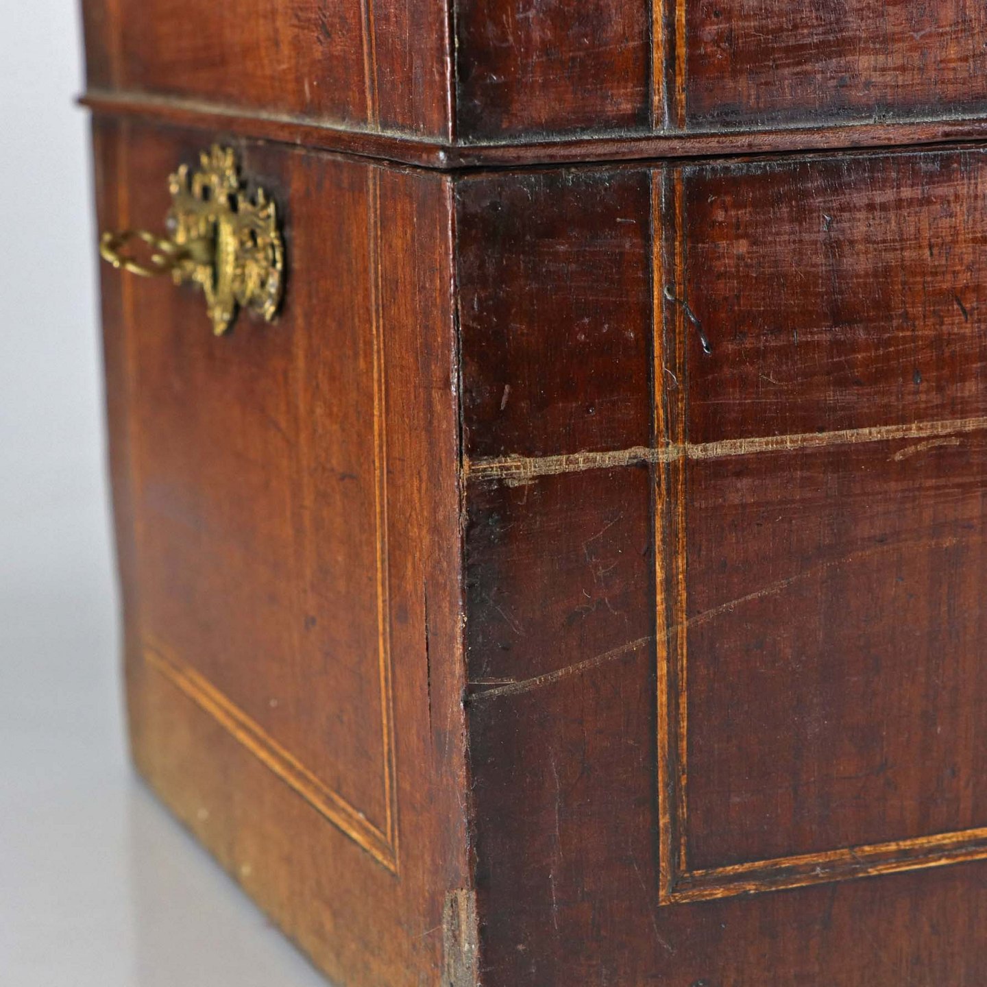 Text available in Danish: Tantalus med plads til 4 karafler. Skrinet er af lakeret træ med messing håndtag og lås og er foret med stof
