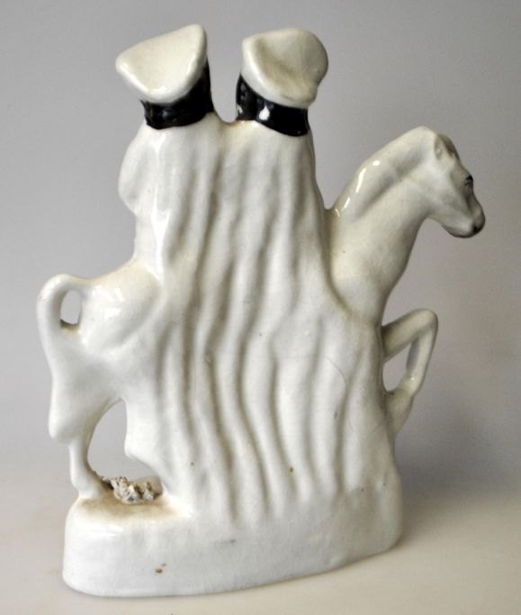 Staffordshire figur, bemalet fajance, "Going to Market", 19. årh. England. Hvid fajance med forgyldning. En mand og en kvinde siddende på en hest. H.: 22,8 cm. L.: 19 cm.