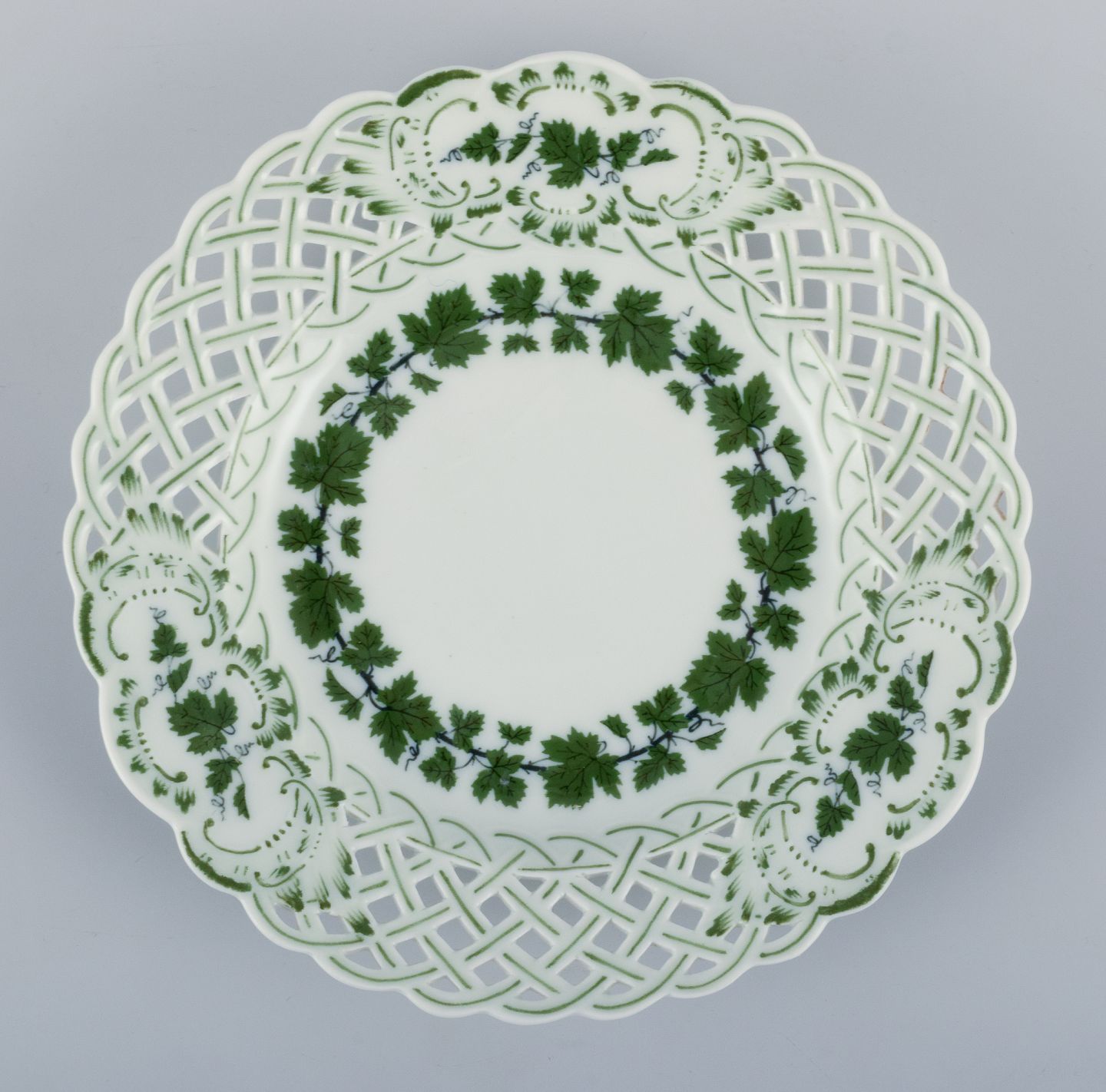 Meissen, Germany, Green Ivy Vine, a set of eleven small plates with reticulated edges. Hand-painted.