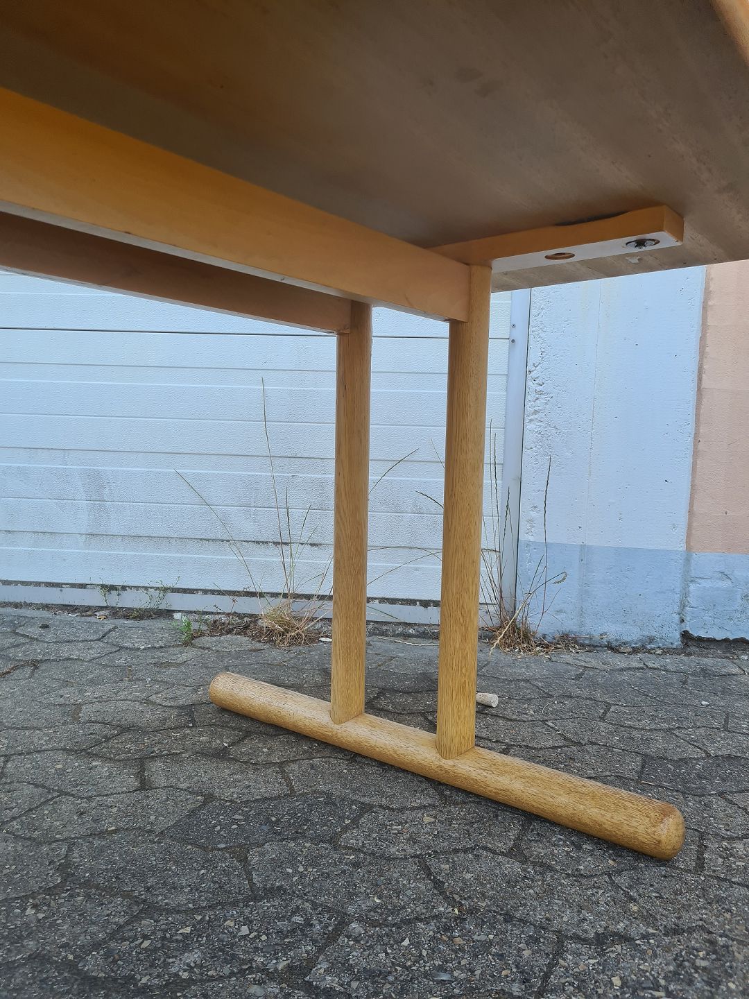 Bordet har brugsspor på pladen og stolene har slidt betræk.