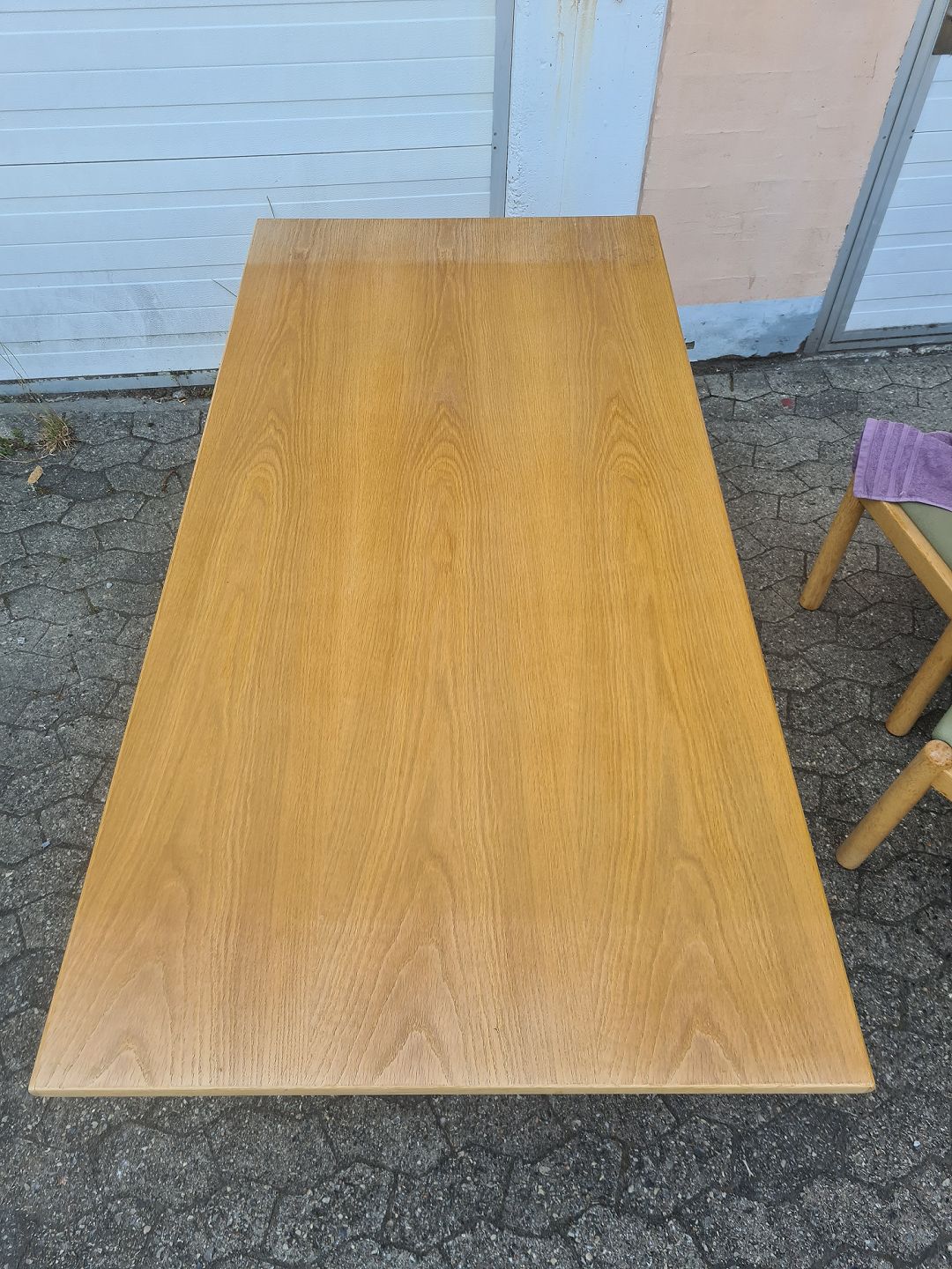 Bord i fineret egetræ med 6 stole, fra 1980erne.