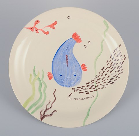 Stig Lindberg for Gustavsberg. "Löja" plate. Hand-painted with a fish motif. Satirical illustration with Swedish text.