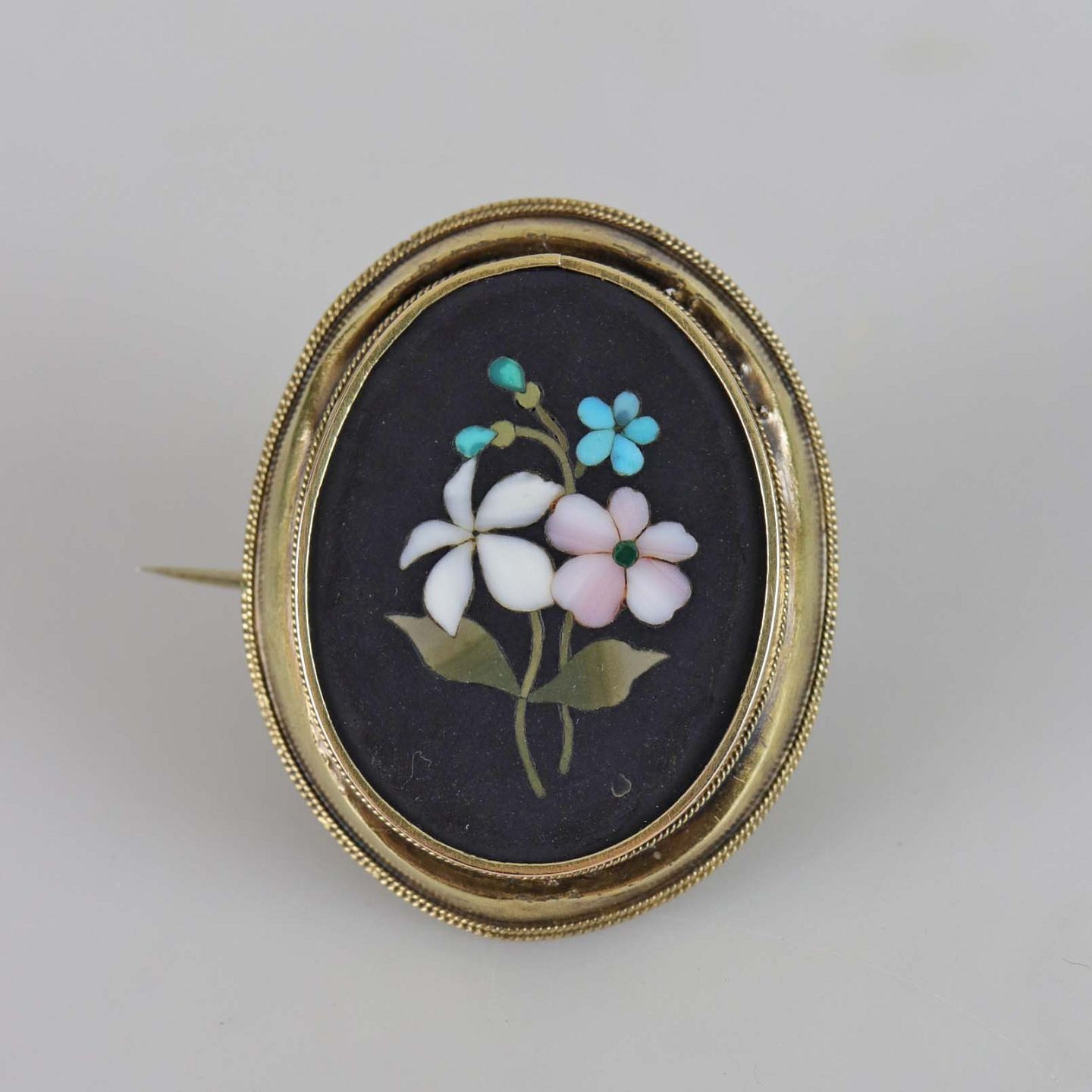 Text available in Danish: Gammel Pietra Dura broche med 14 karat guld.