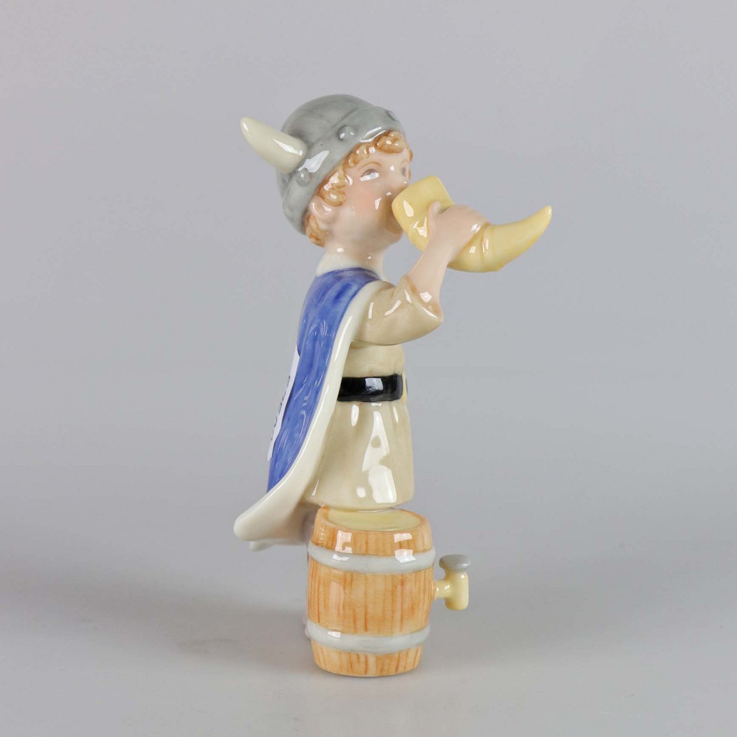 Text available in Danish: Årets Viking 2004 i porcelæn fra serien Mini Collection Viking. Dreng med sværd, ølhorn og øltønde. No 128 Vikingenavn: Bjarke