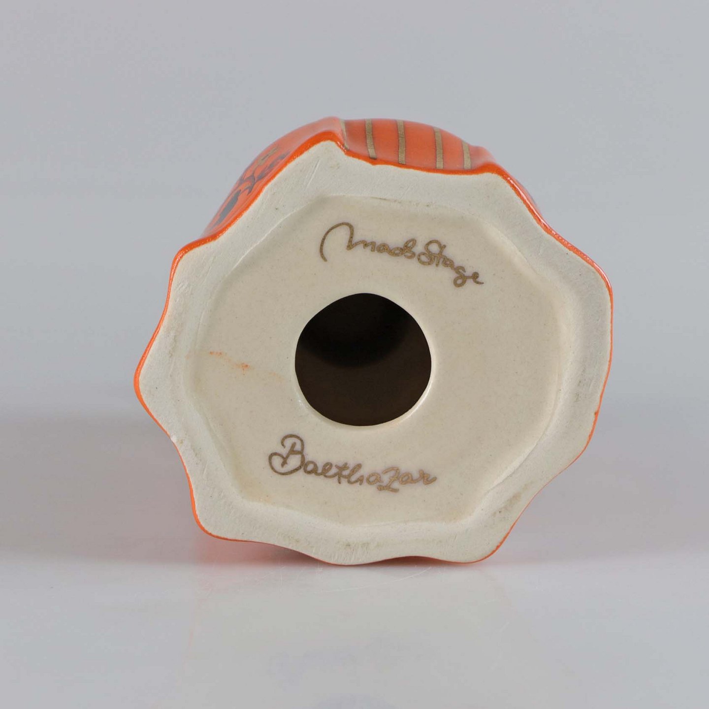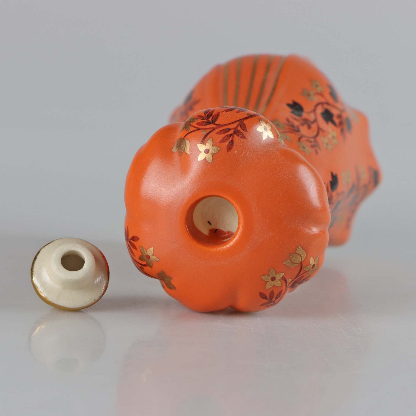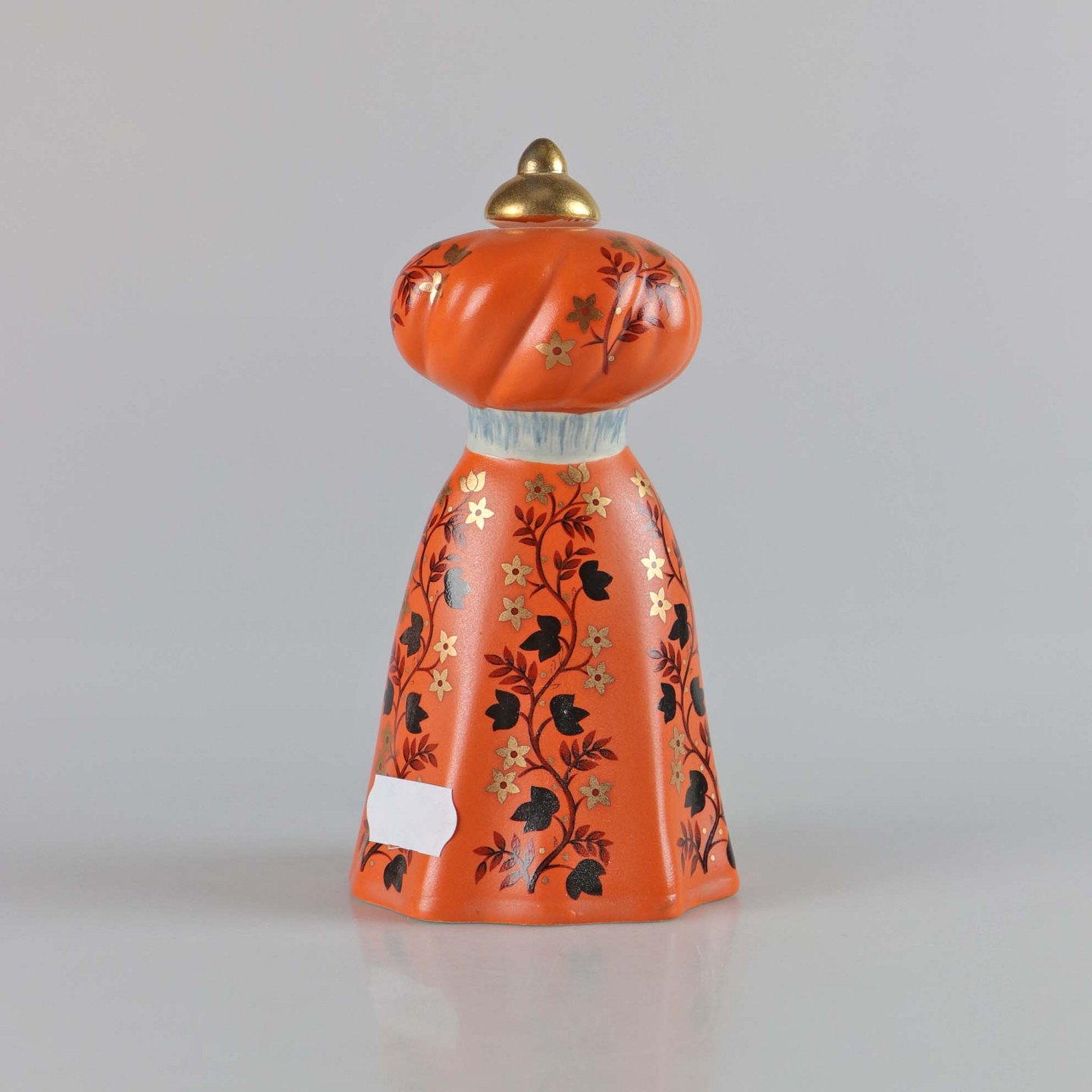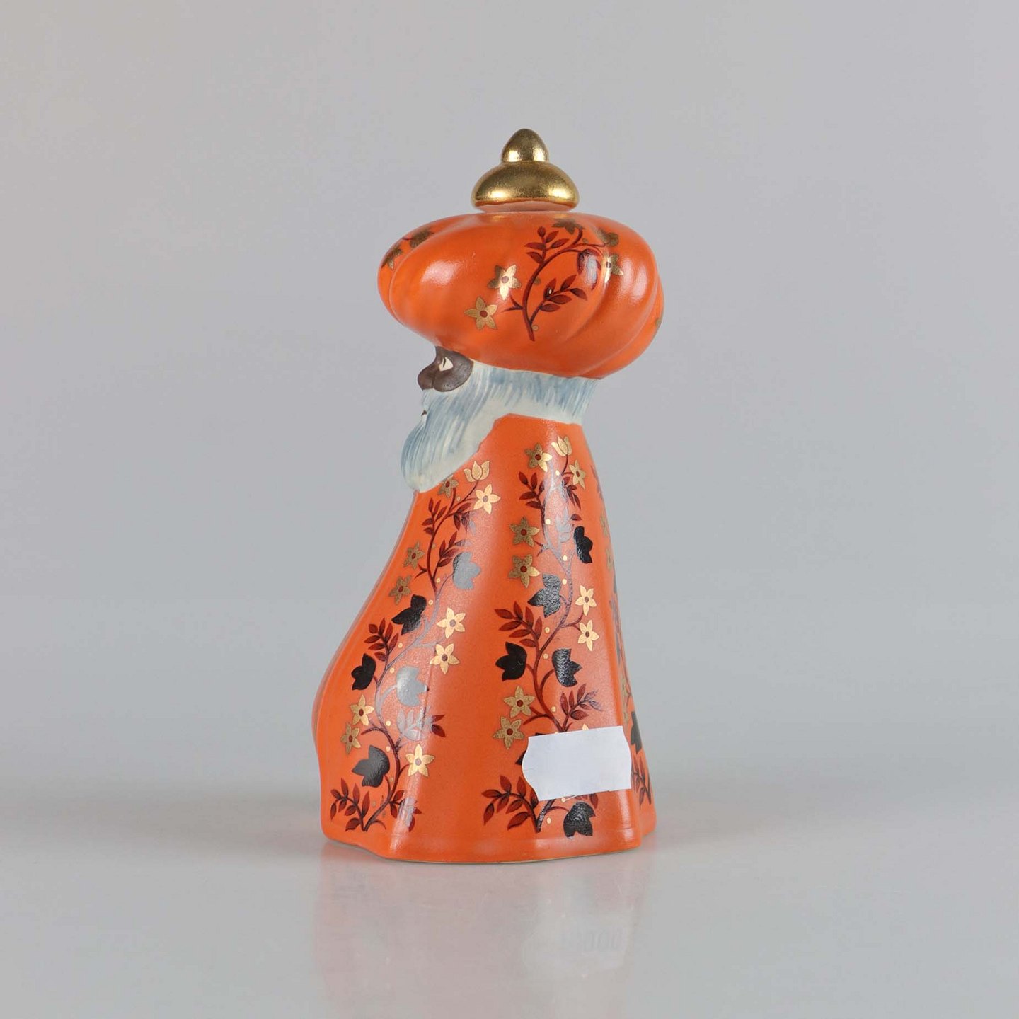 Figur i porcelæn. Balthasar fra De tre vise mænd. Når guldknoppen tages af, er der hul til et kerte lys. De hellige tre konger