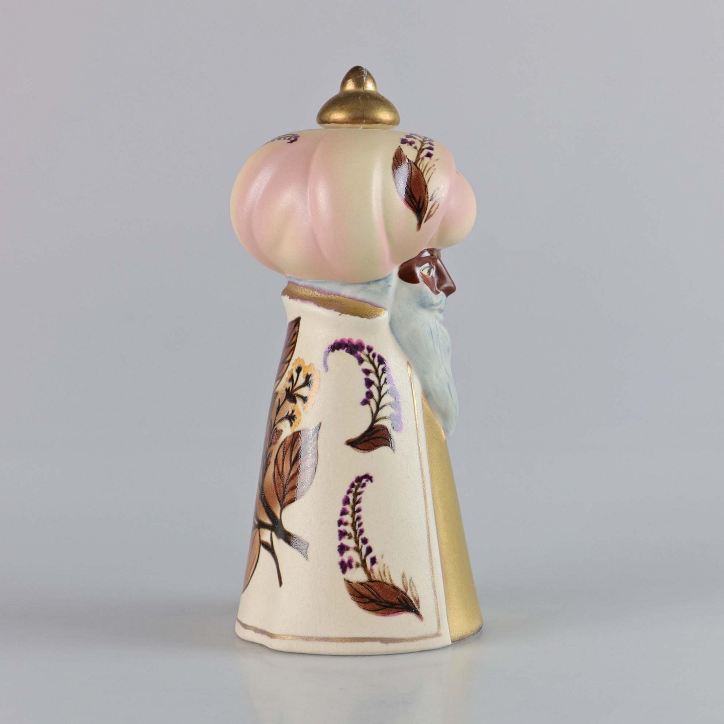 Figur i porcelæn. Melchior fra De tre vise mænd. Når guldknoppen tages af, er der hul til et kerte lys