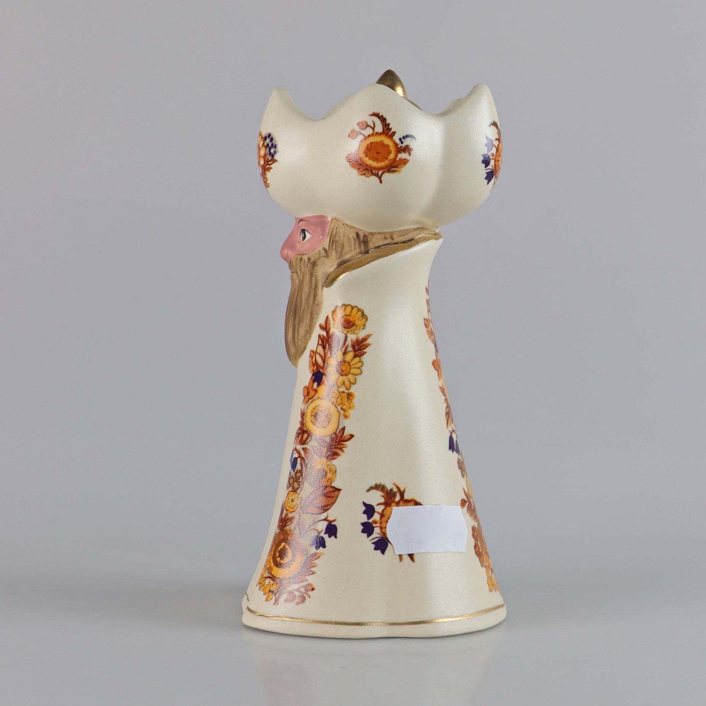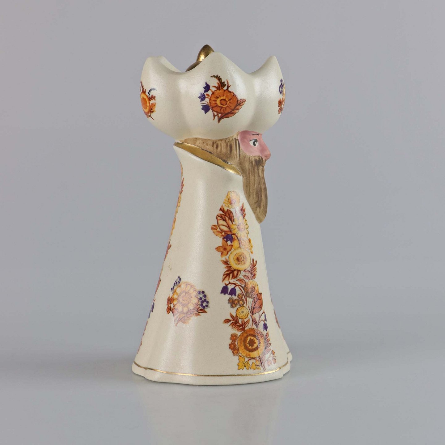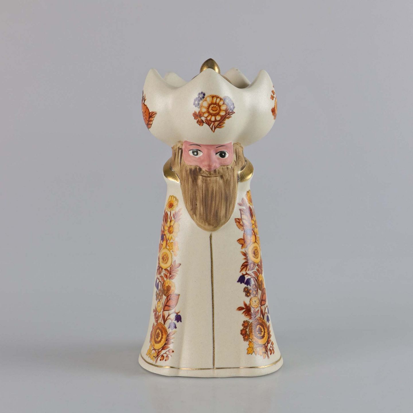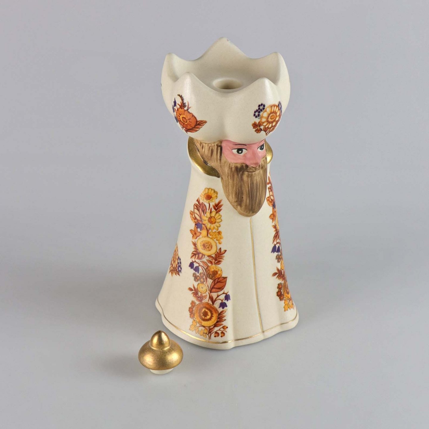 Figur i porcelæn. Kaspar fra De tre vise mænd. Når guldknoppen tages af, er der hul til et kerte lys. En af de hellige tre konger