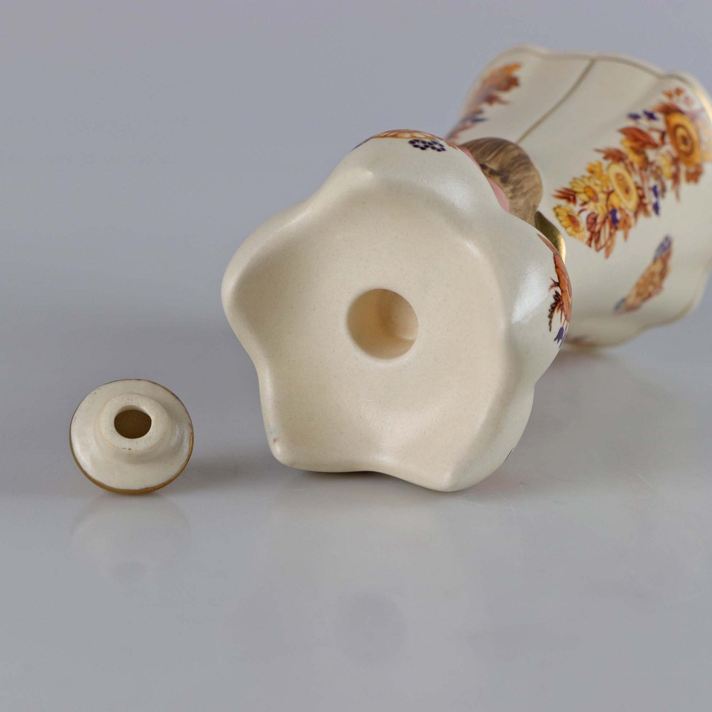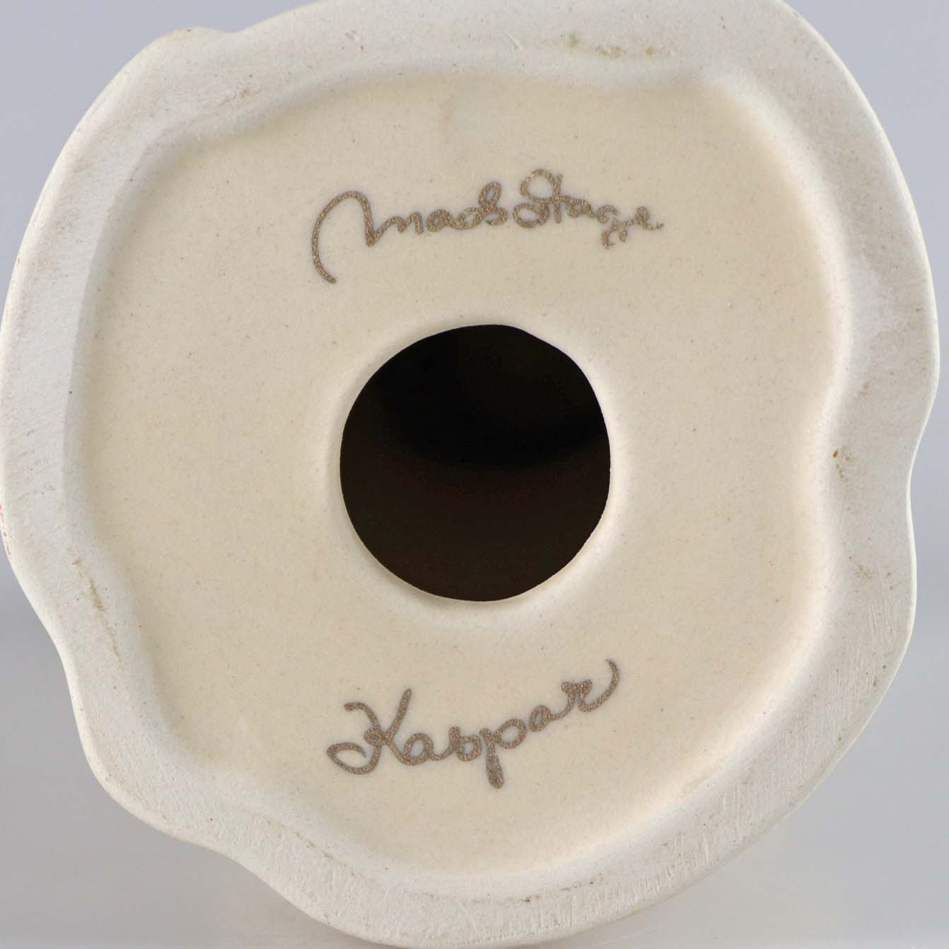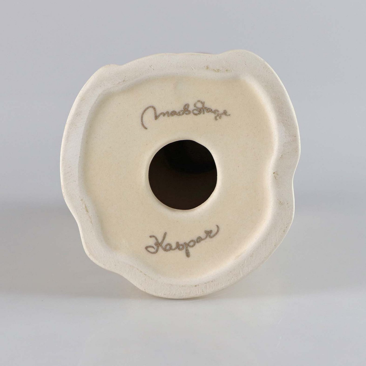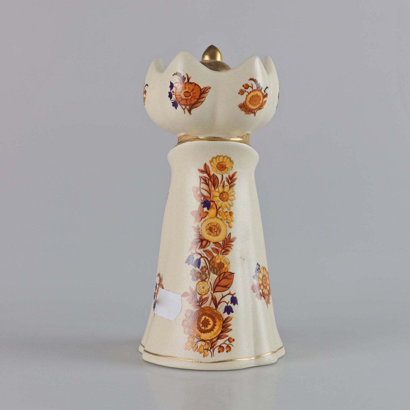 Figur i porcelæn. Kaspar fra De tre vise mænd. Når guldknoppen tages af, er der hul til et kerte lys. En af de hellige tre konger