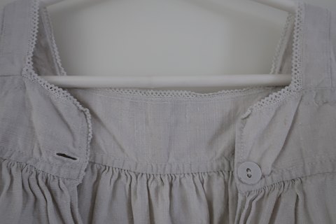 An antique shift with hand made buttonholes, embroidered hand-made initials and other items to make the dress beautiful.
