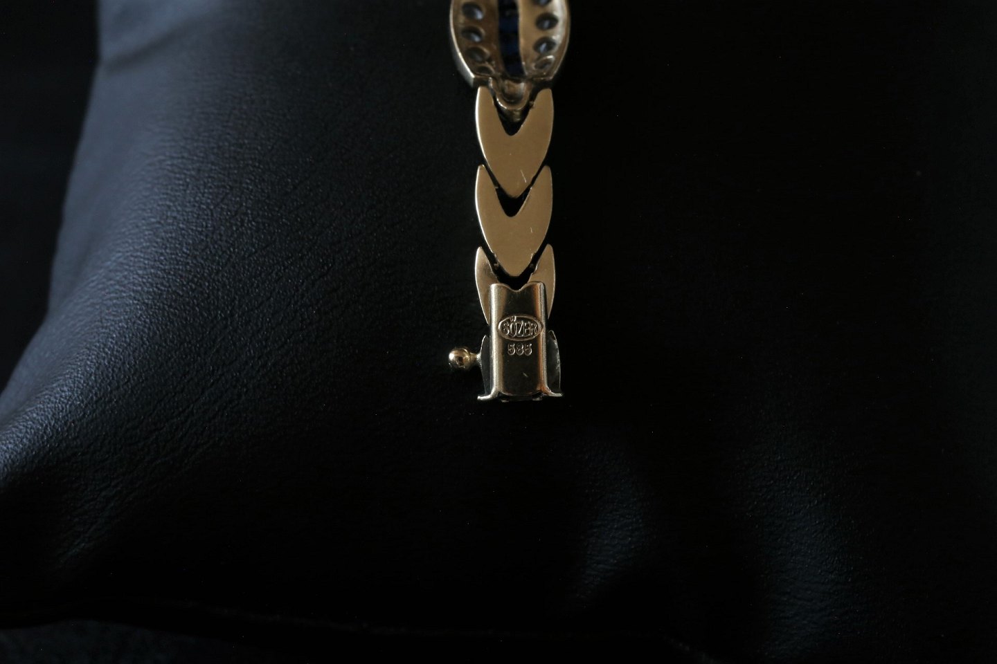 Gold bracelet with inlaid swarovski stones and blue sapphire in 14 carat gold, with box lock