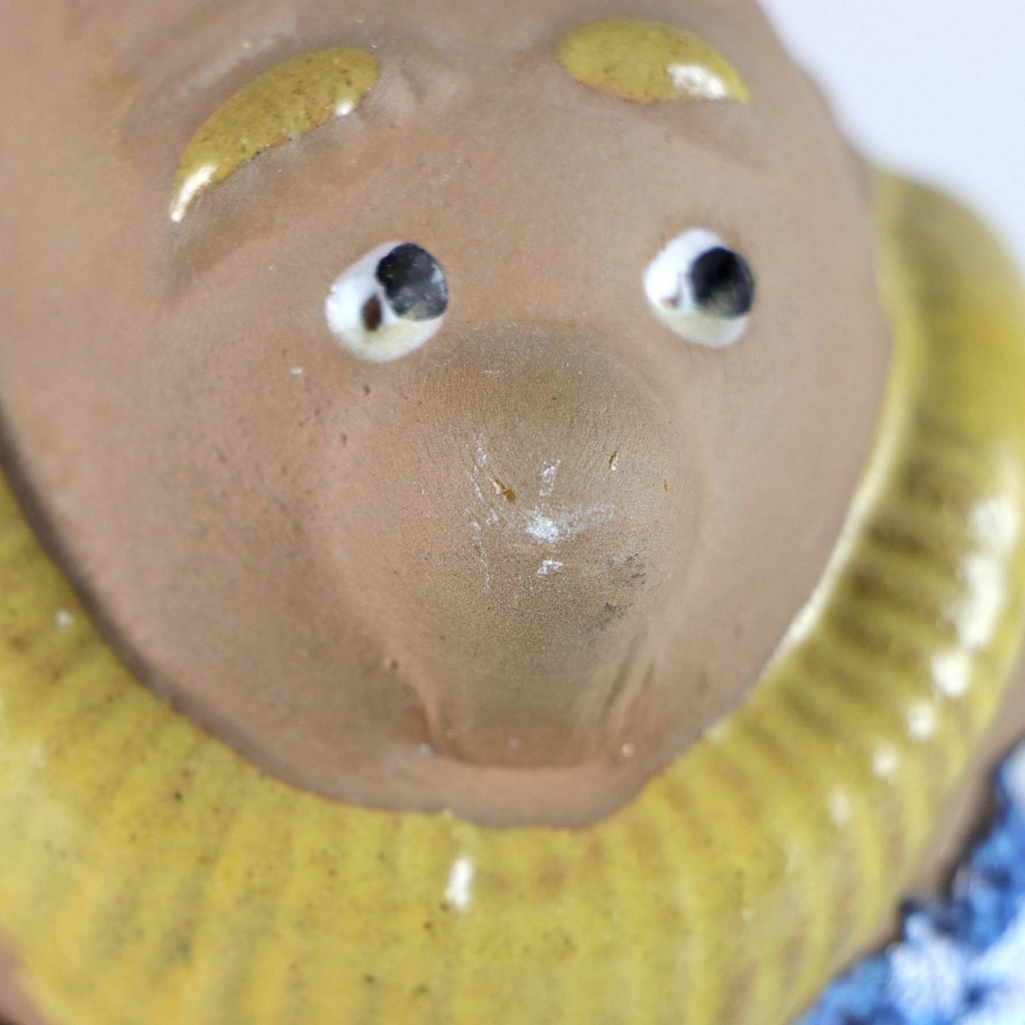 Figur af keramik, udformet som en skaldet mand med skæg og blåt tøj