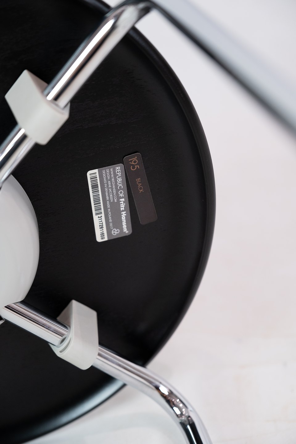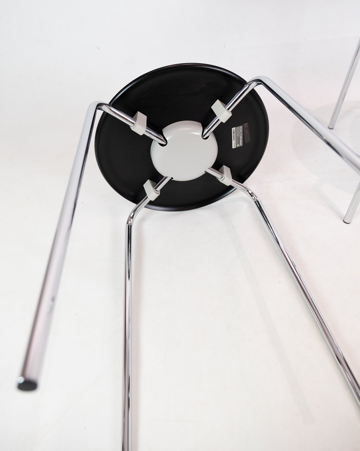 The stools have a frame of chrome-plated steel tube, which gives them a light and elegant appearance. The seat is made of black ash veneer, which adds warmth and contrast to the streamlined steel frame. The simple and functional shape makes these stools suitable for a wide range of interior styles and uses.