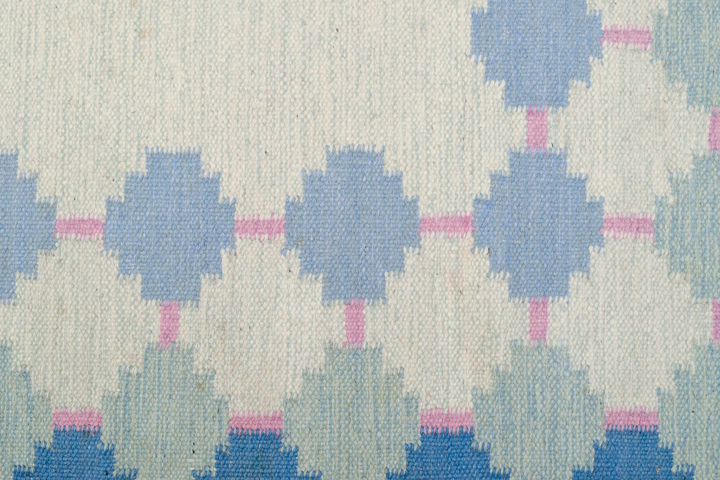 Swedish textile artist. Handwoven wool carpet in Rölakan technique. Modernist design. Blue and pink colors in a geometric pattern.