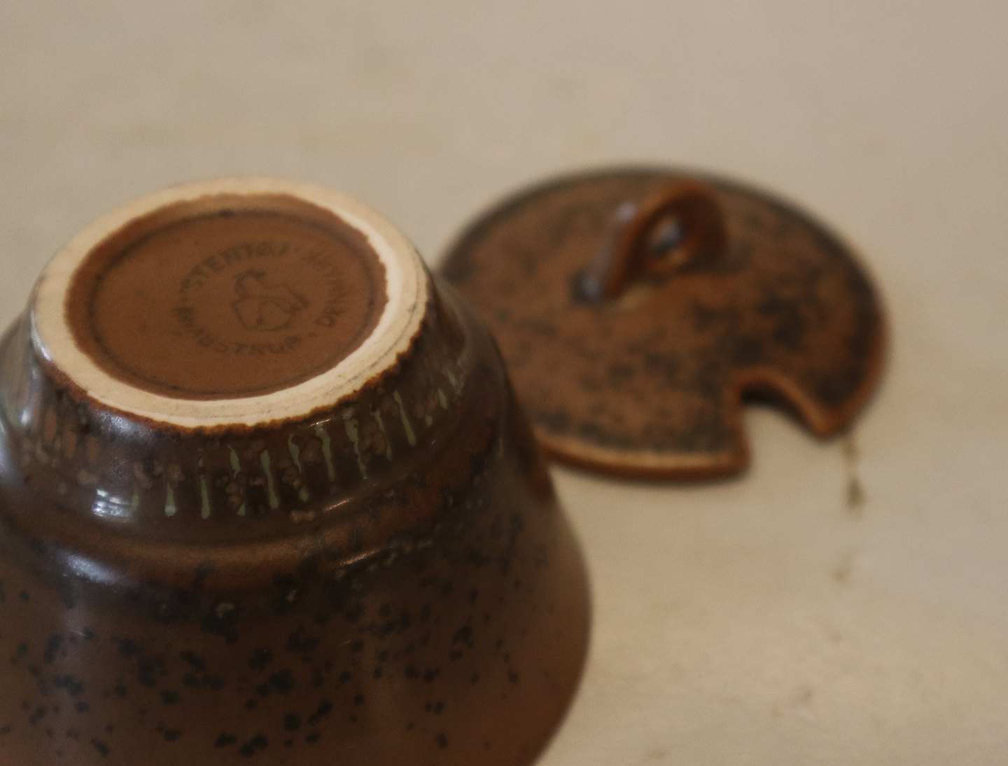 Mustard jar with lid 5.5 x 8 cm Small sugar bowl Noeddebo Brown Ceramics Stoneware Danish Art Pottery Knabstrup