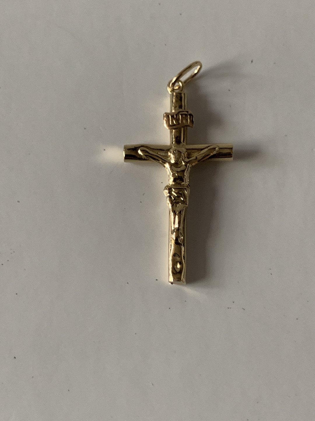 Beautiful and iconic gold cross in 14 carat gold, with many beautiful details. The cross is designed with the suffering Christ on the cross, with the inscription INRI above Christ. INRI is the Latin abbreviation for "Iesus Nazarenus Rex Iudaeorum" - or in Danish, Jesus from Nazareth, King of the Jews. It is a strong religious symbol that will make a splendid necklace in a nice gold chain.