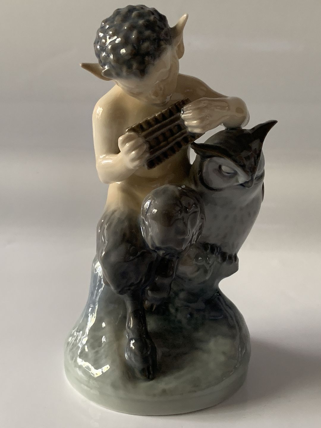 Beautiful little figure depicting Faun with owl. The figure is from Royal Copenhagen, 1st assortment and is made with beautiful colors and details. Figures from Royal Copenhagen are beautiful decorative objects that can be part of collections, or decorate a bookcase or windowsill. With a height of 16 centimeters, it is a nice little figure that will look great in any home.
