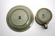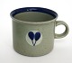 Text available in Danish: Knabstrup, Kattegat stentøjsstel grå glasur med blå kant og bærmotiv. Designet af Inger Persson 1975. Tekop. Diameter 8,5 cm. Højde 6,5 cm. Underkop diameter 16 cm. Pris: 100 kr. stk. Lager: 5