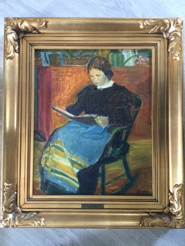 Text available in Danish: Maleri af Rud-Petersen - Læsende kvinde i gyngestol.
