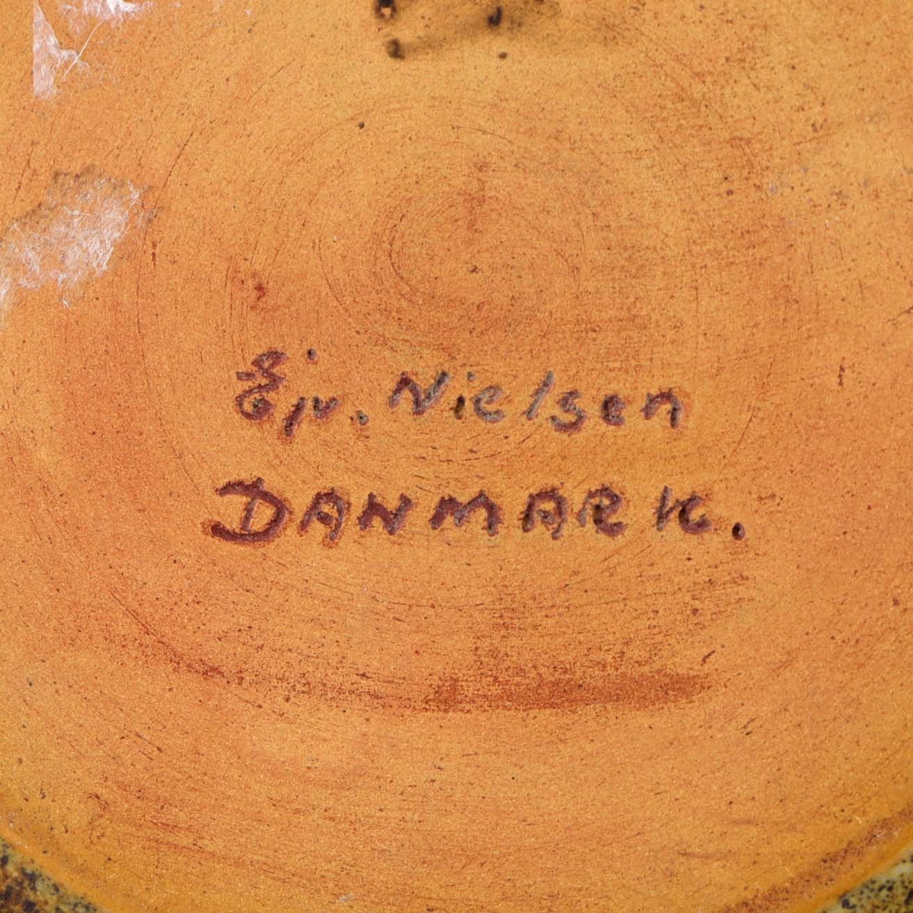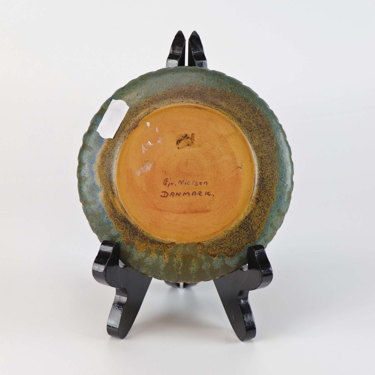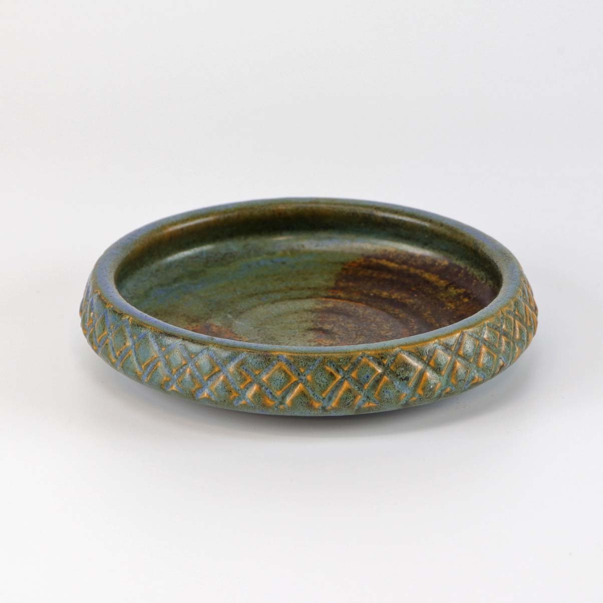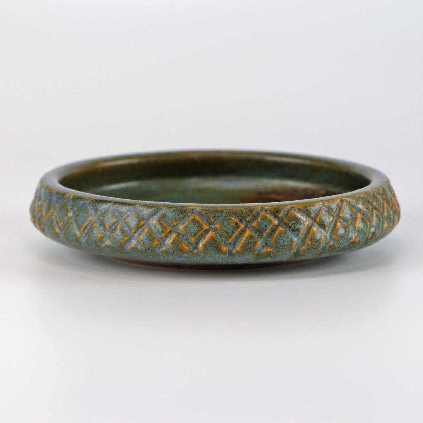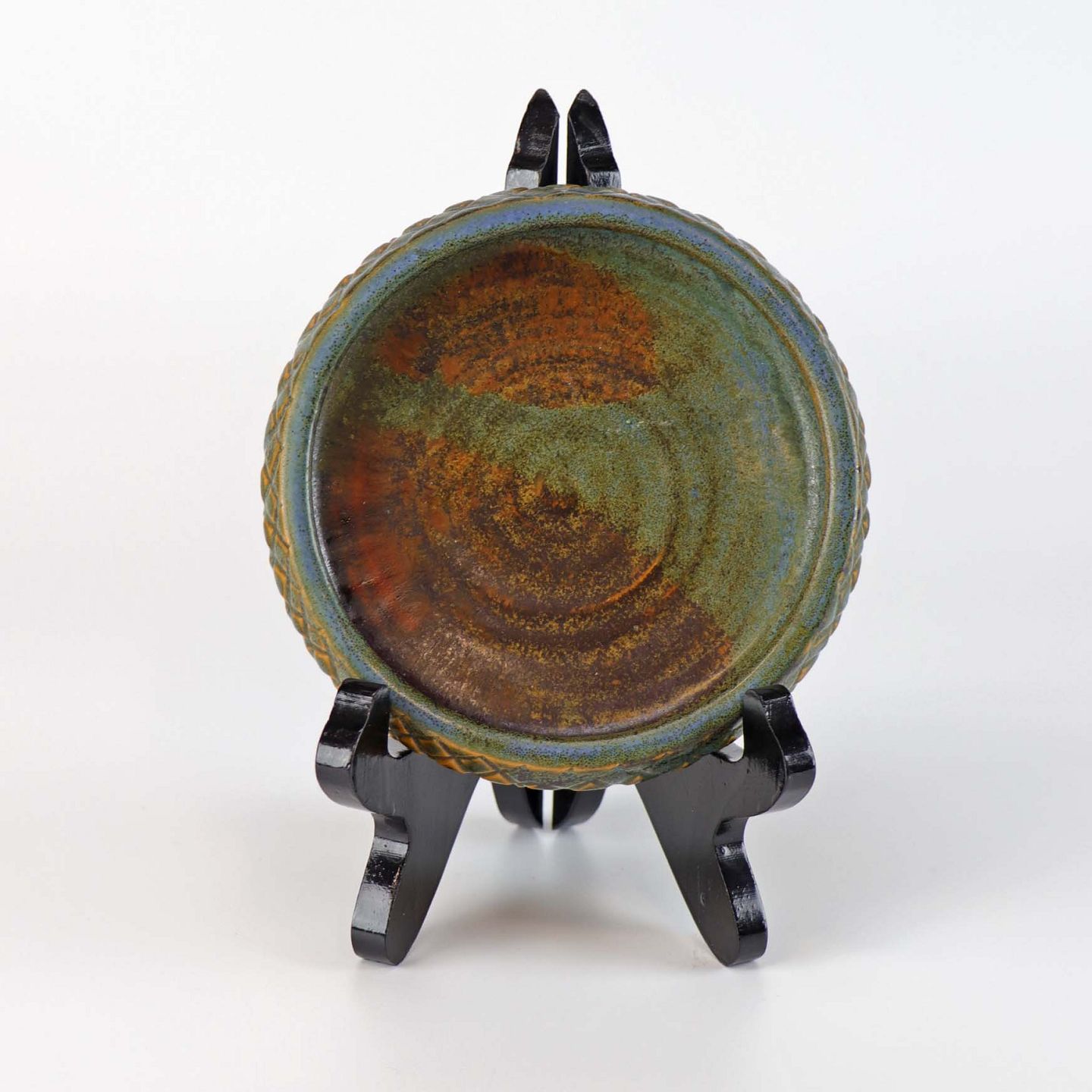Skål af stentøj i blå og brune farver med rødbrune nuancer