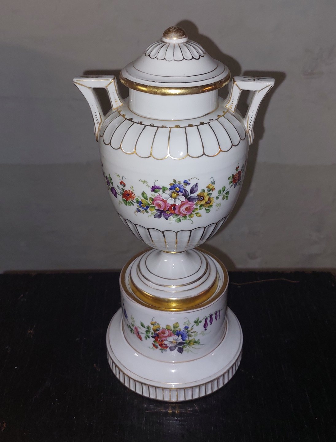 Urn vase cup with lid in porcelain standing on plinth. Painted with flowers. Manufactured at the German porcelain factory Von Schierholz between 1907-1927. All three parts in good condition. No damage or repairs. Factory mark. H. 30.5 cm