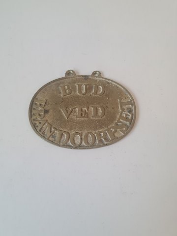 Badge in brass with the text "Bud ved brandcorpset"