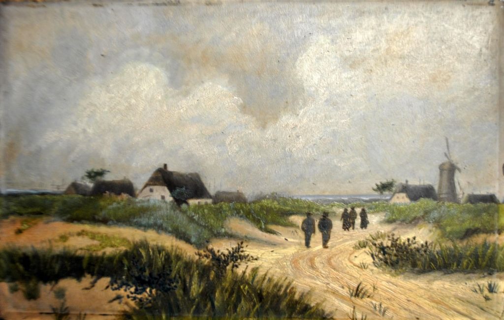 Herschend, Oscar (1853 - 1891) Danmark: Folk på en vej i klitterne. Usigneret. Olie på skiffer. 28 x 28,5 cm.