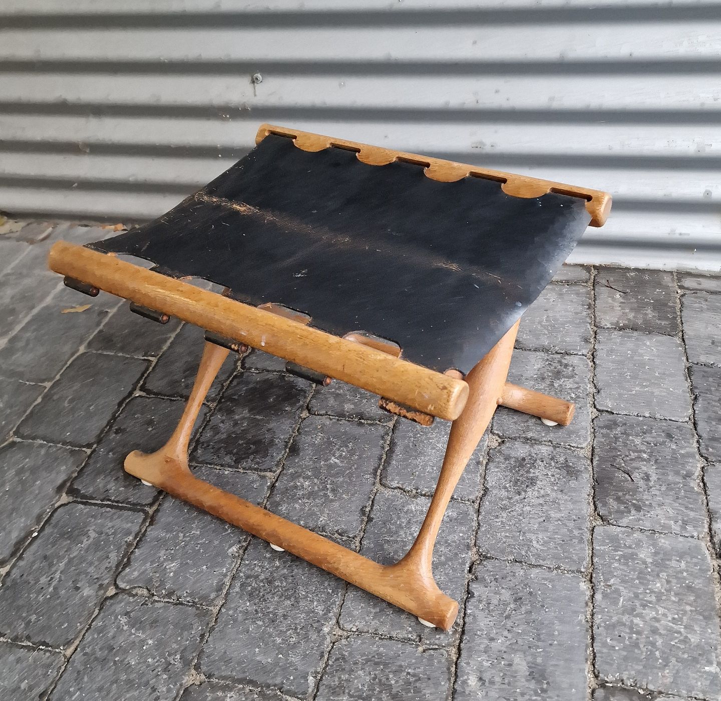Taburet af ege træ og original patineret læder. Kan klappes sammen
