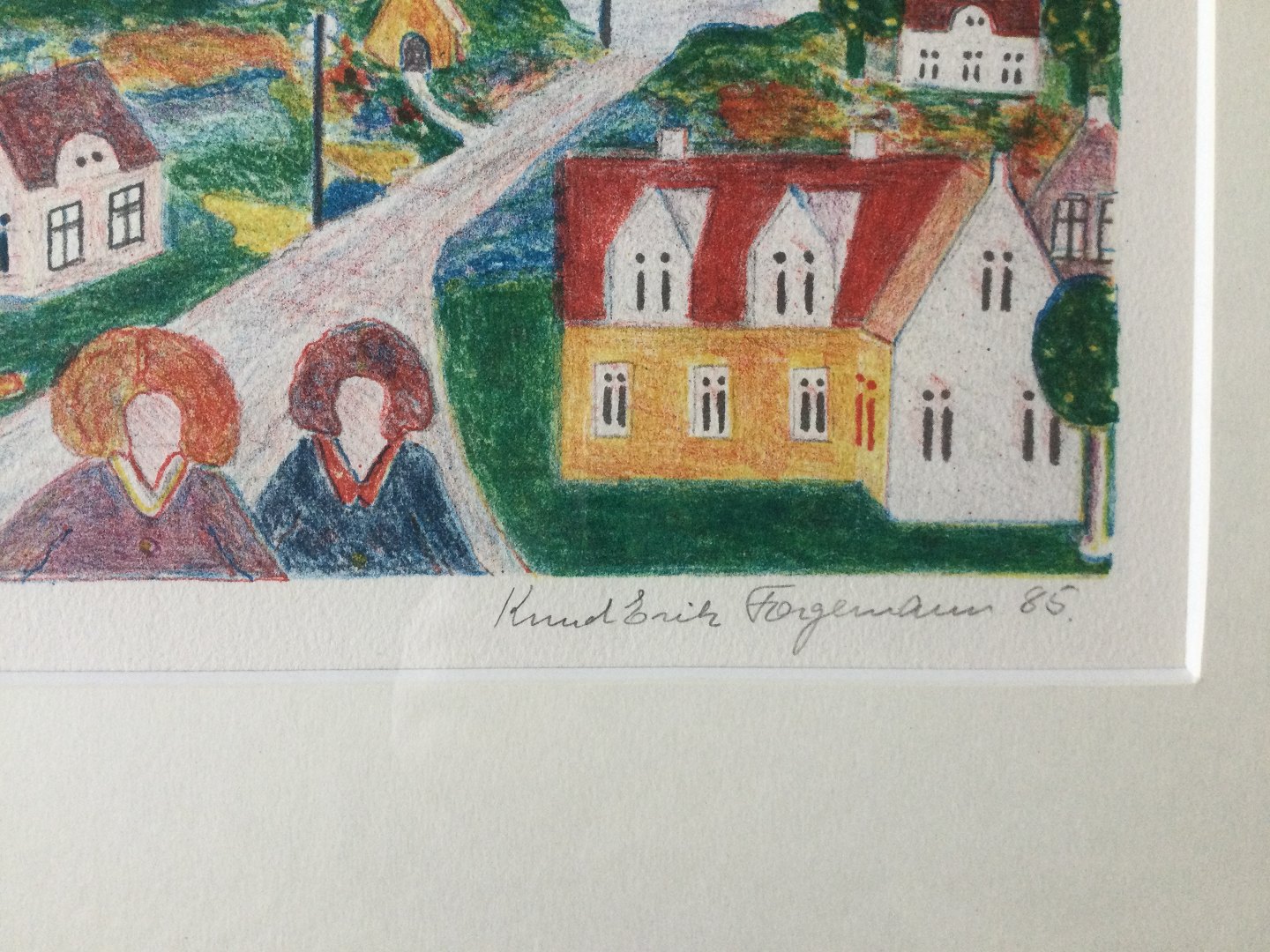 Text available in Danish: Farve litografi af Knud Erik Færgemann 1985 - Vej gennem landsby med personer.