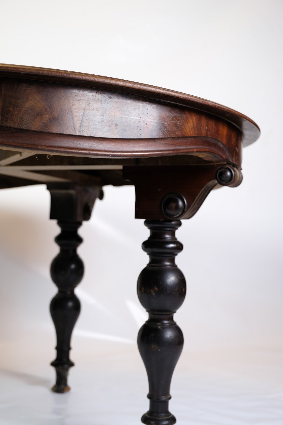 Mahogany dining table with round legs with carvings from around the 1880s.