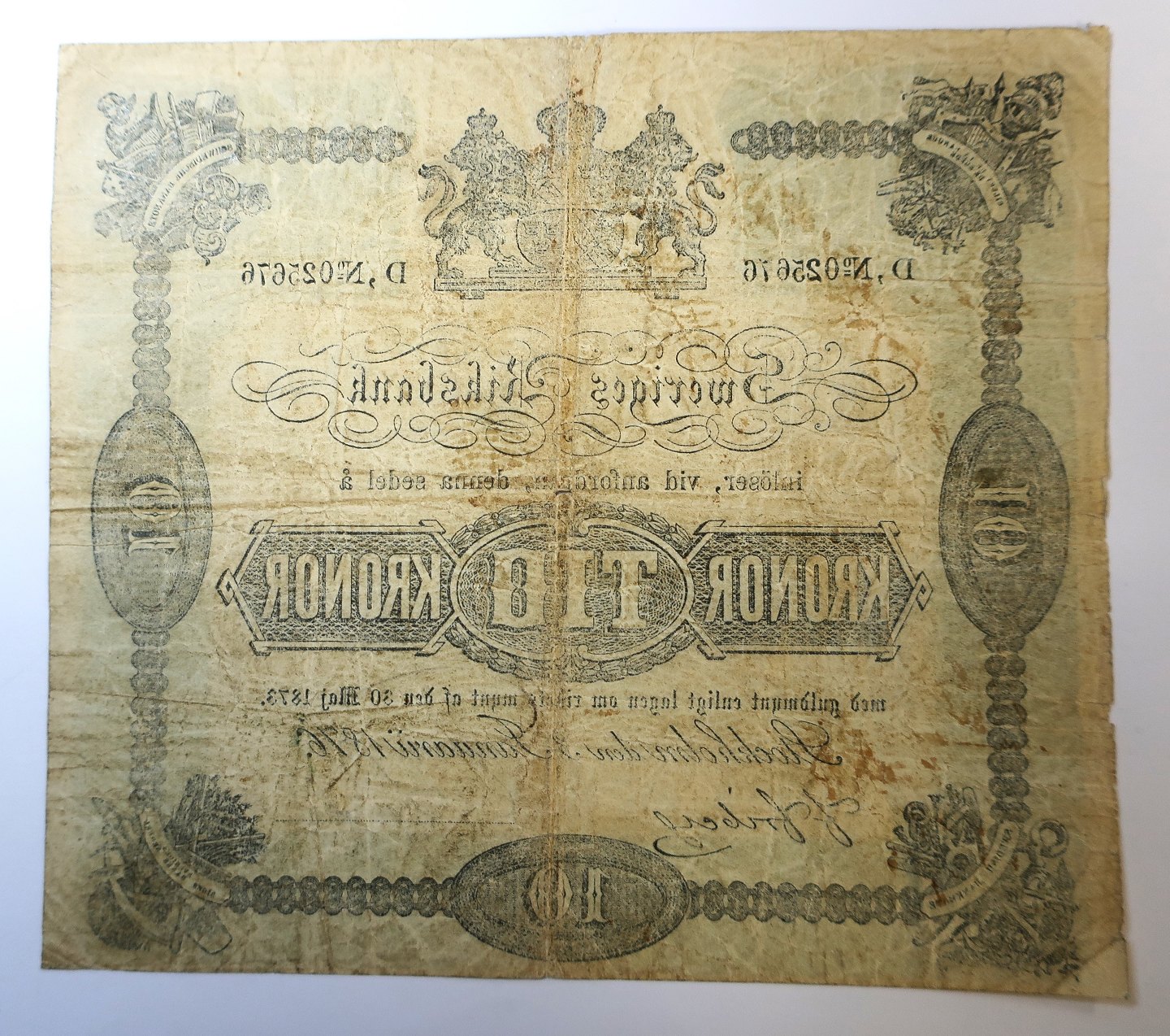 Sweden. 10 krone note from 1876. There is a small hole in the middle