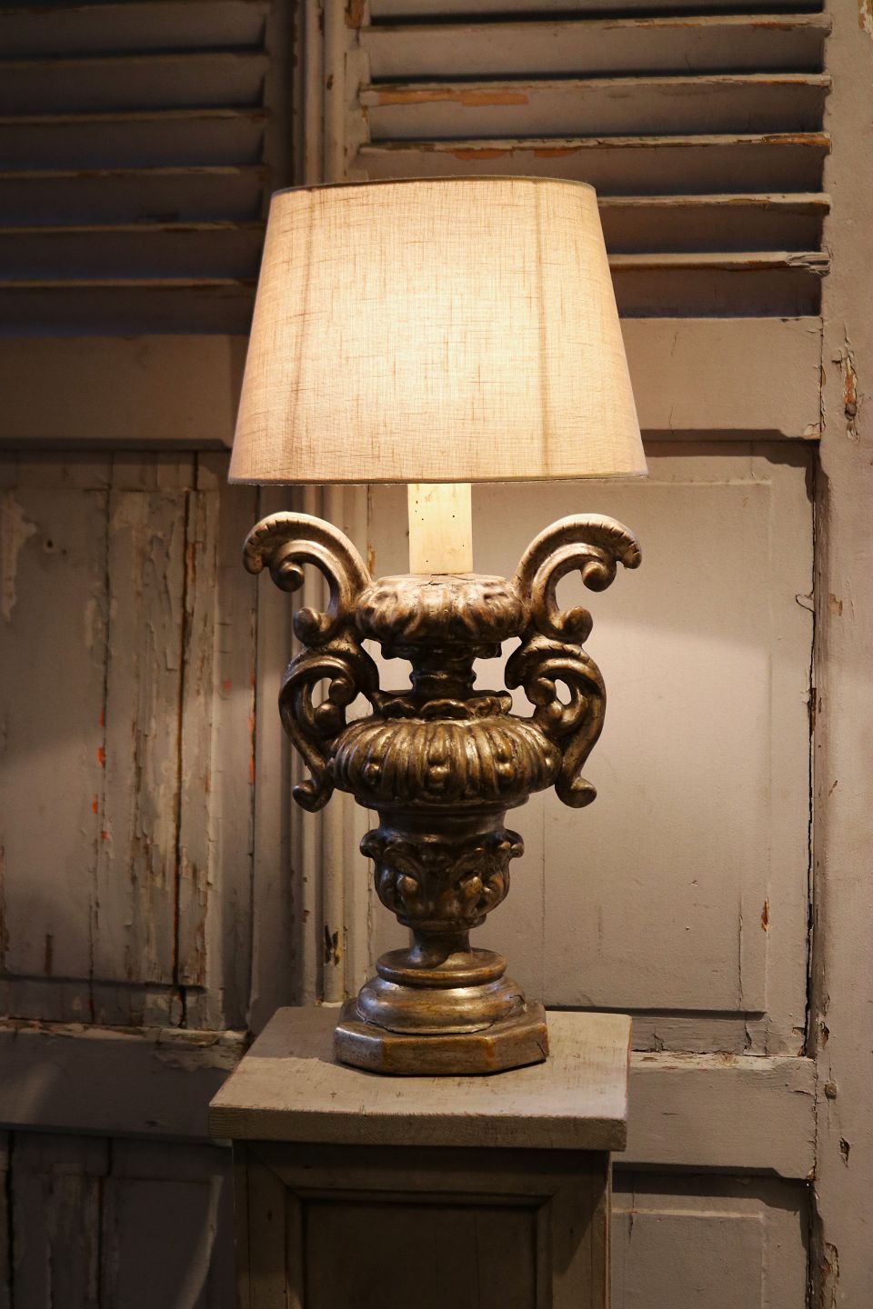 Gammel fransk bordlampe i udskåret træ med sølvbelægning med en rigtig fin patina...