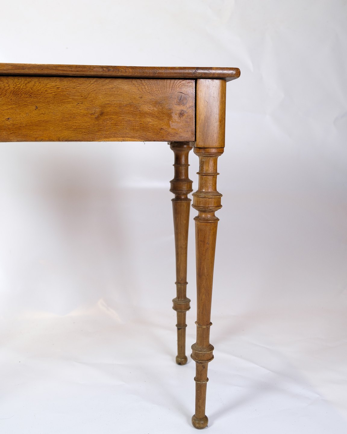 Side table made of plain oak, as an entryway piece of furniture with round legs from around the 1890s.
