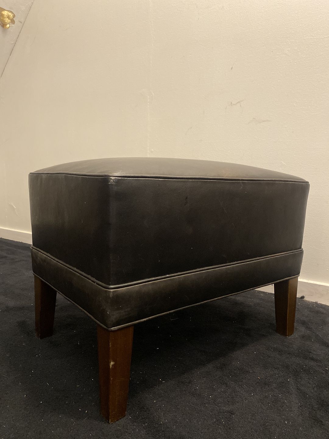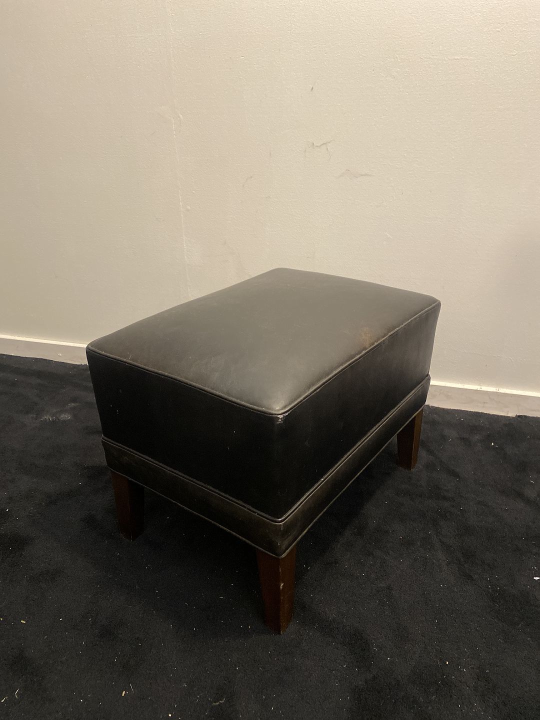 Fodskammel i sort læder og på mahogni ben. Fremstår pæn og velholdt uden nævneværdige brugsspor.