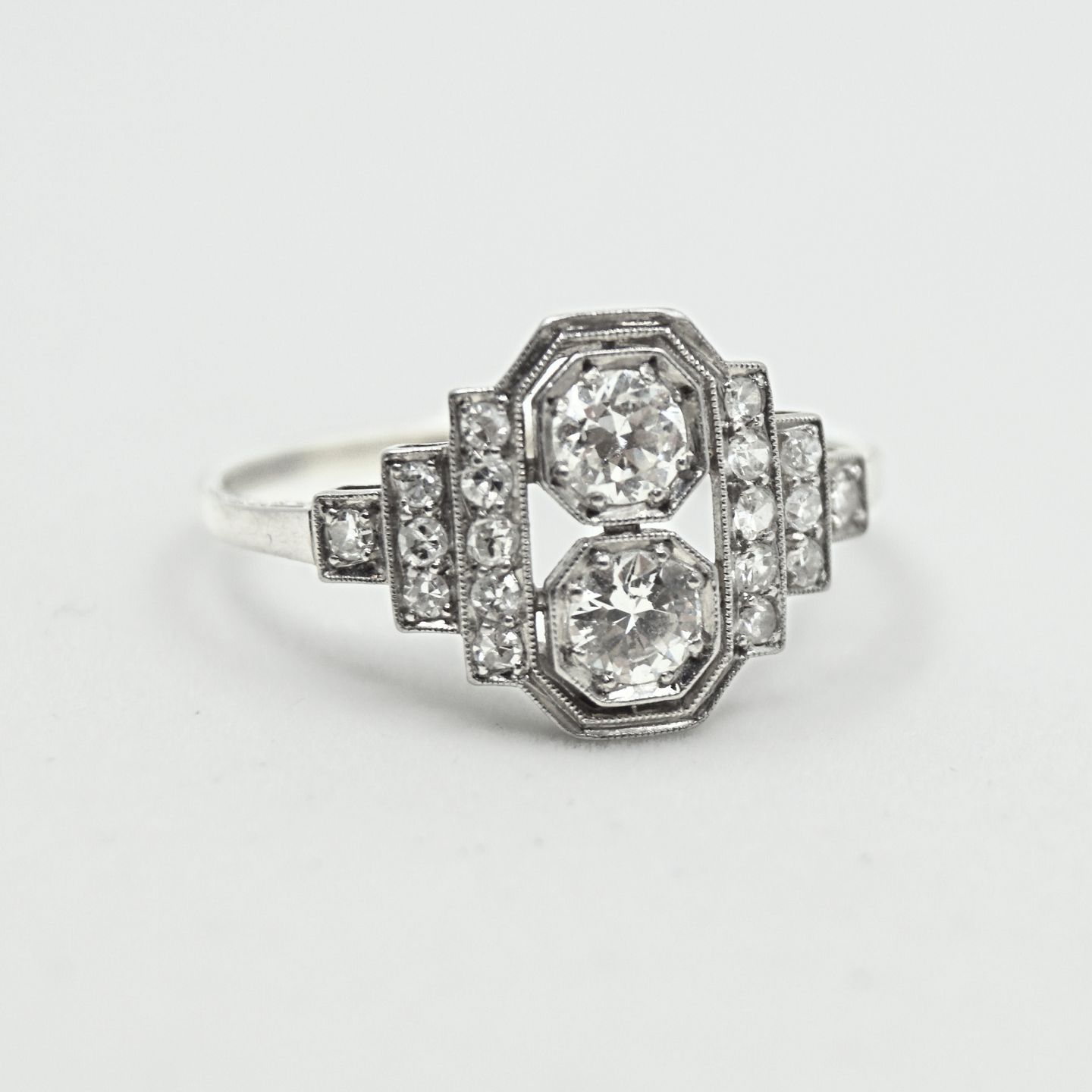 Ring of 18k white gold in art deco style. Set with 2 larger diamonds, with a total of 0.40 ct. W VS. Surrounded by numerous smaller diamonds.