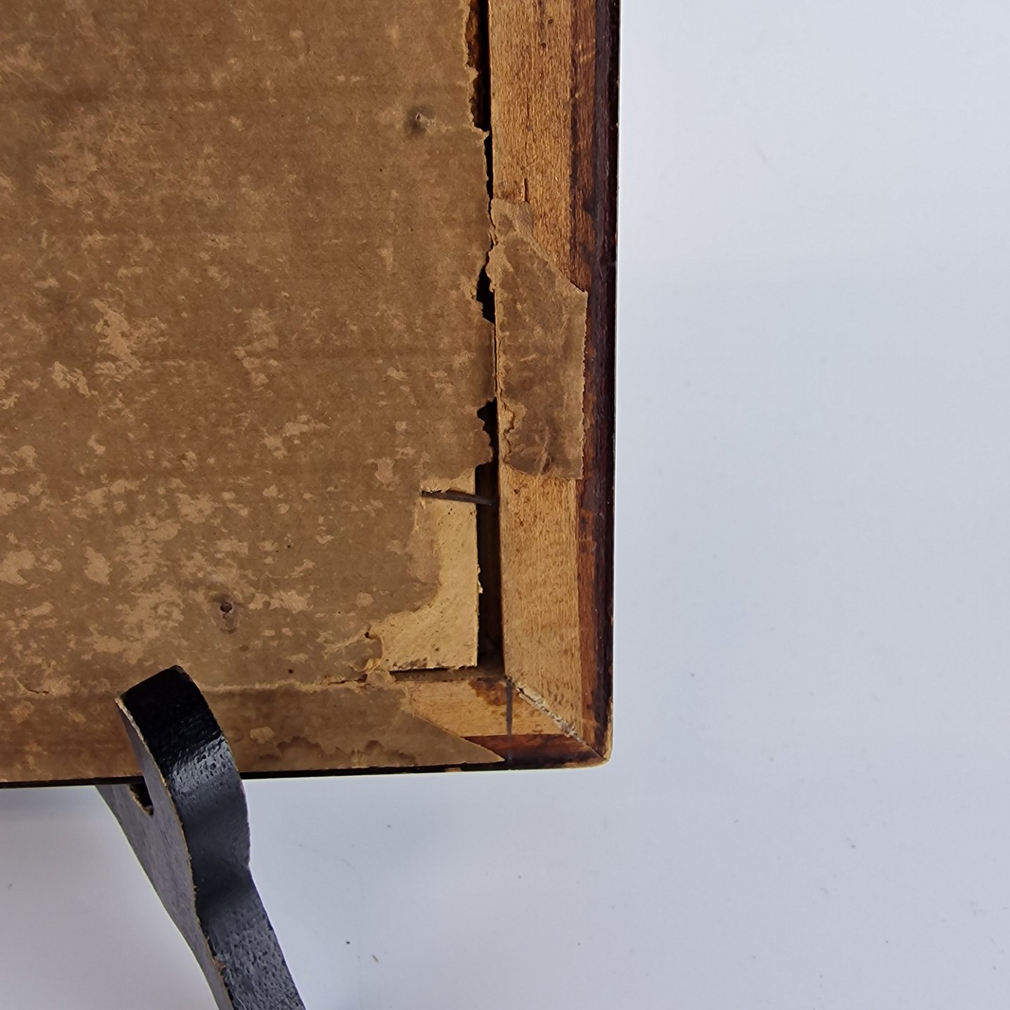 Indrammet ovalt landskabsmaleri i passepartout med motiv af kyststrækning. Et hus beliggende tæt på stranden og seljbåde i havet