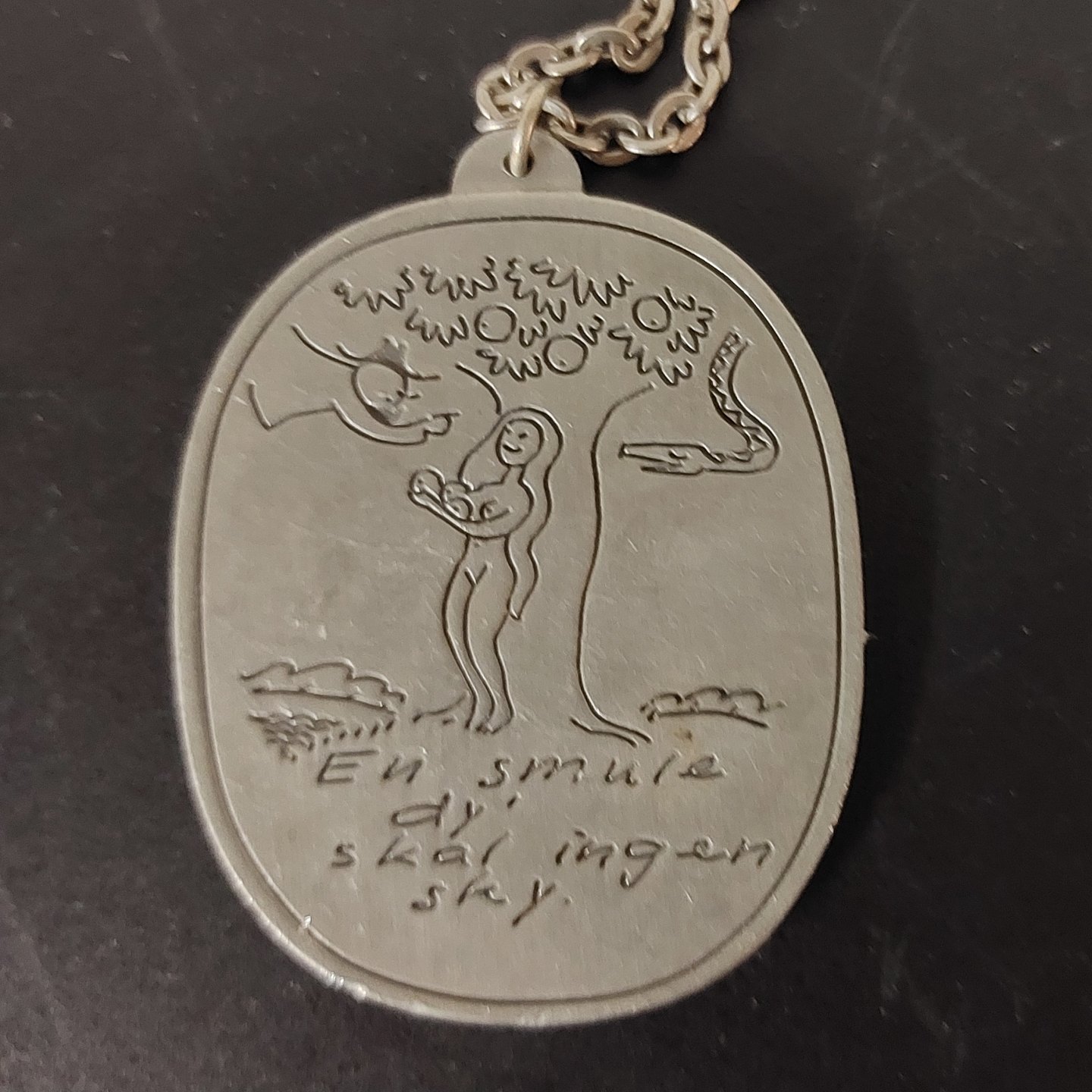 Ellipse-shaped pendant in pewter designed by Jørgen Jensen, with Piet Hein gruk: "En smule dy' - Skal ingen dy'" In good condition. The pendant measures 4.5 x 6.5 cm