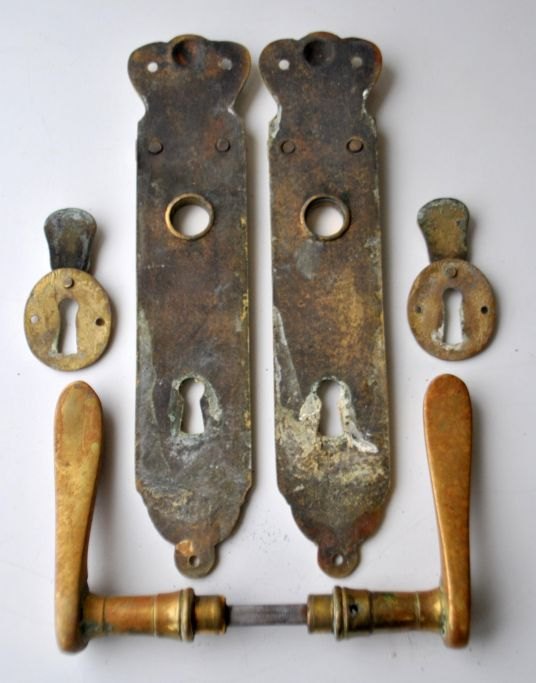 Door handle with bracket and two locks in brass. Jugend. 20th century Denmark