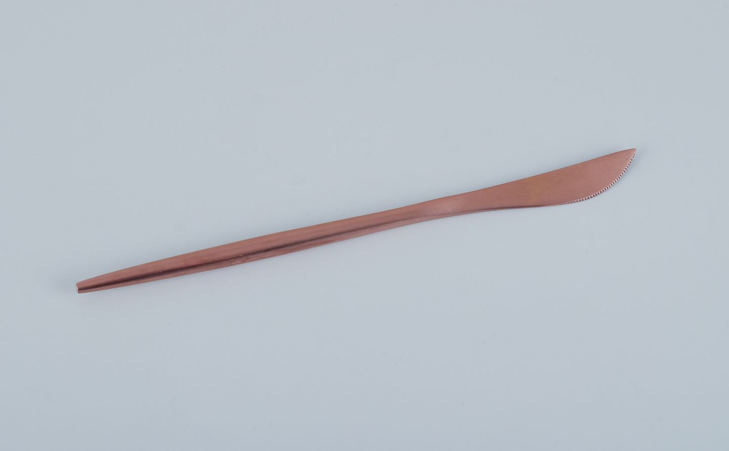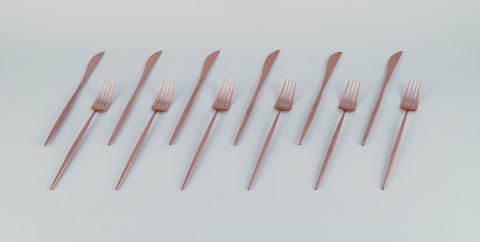 A six-person modernist dinner flatware set in brass, consisting of six dinner knives and six dinner forks.