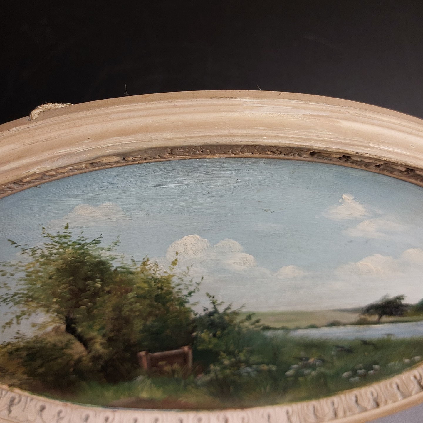 Painting on oval plate. Painted landscape motif on terracotta plate from Peter Ipsen, Copenhagen, approx. 1900. The plate has a repair at the very edge. See photos with the arrow. Factory mark on the back. Dimensions: 19.5 x 29 cm