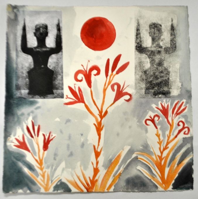 Degett, Karen (1954 - 2011) Danmark: Komposition med rød sol og blomster. Akvarel og tryk på papir. Signeret: Karen Degett. 40 x 40 cm.