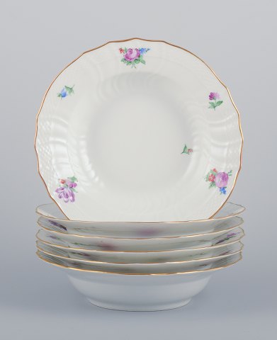 Royal Copenhagen Saxon Flower. Six deep plates in porcelain. Hand-painted with polychrome flowers. Gold rim. Extra deep model.