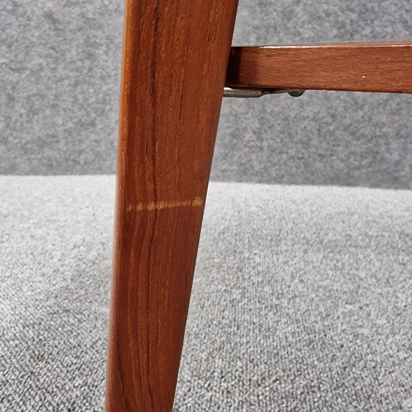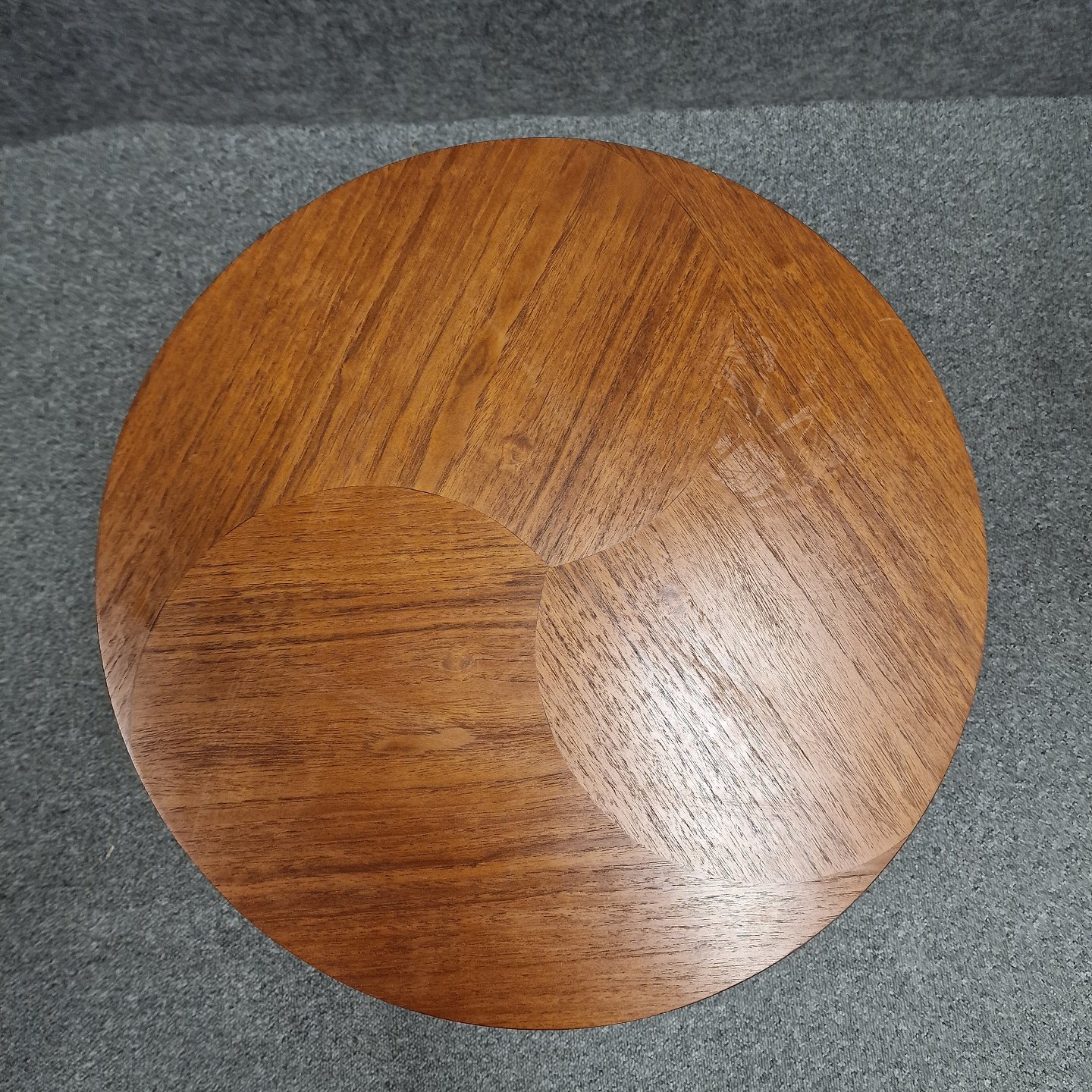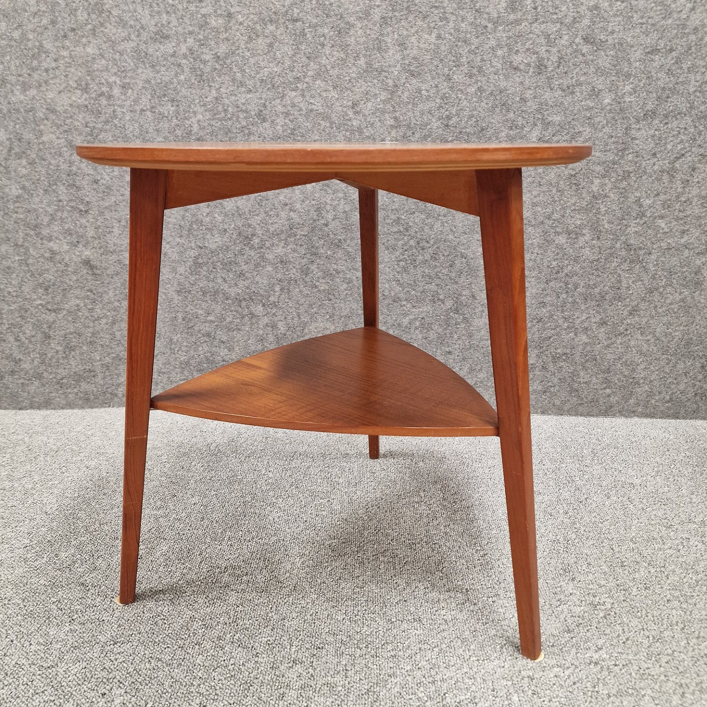 Rundt bord af teak, med 3 ben og trekantet hylde