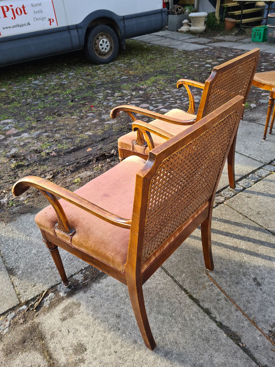 Text available in Danish: 2 Armstole i birk med ryg I rørflet og velourbetrukket sæde. Svensk produceret i 1930'erne. Fremstår pæne, velholdte og udmærket stabile. Dog med brugsspor på sæderne.