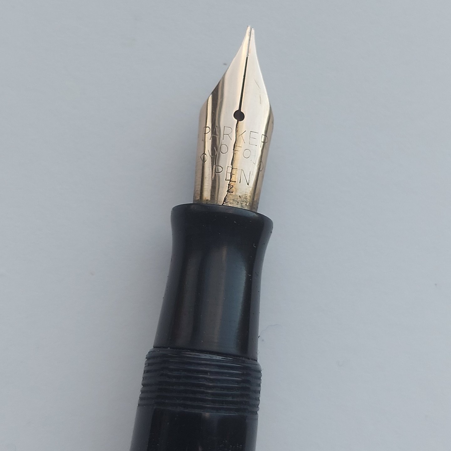 Black flat-top Parker Duofold fountain pen. "Push-button" filler. Does not work. A new rubber sac must be inserted before it works again. Costs DKK 250,- extra if a new bag must be inserted. The fountain pen is in good condition with no damage or repairs. All parts are original Parker parts from the production period, including a nice 14 carat Parker (2) gold nib. L. 13.2 cm