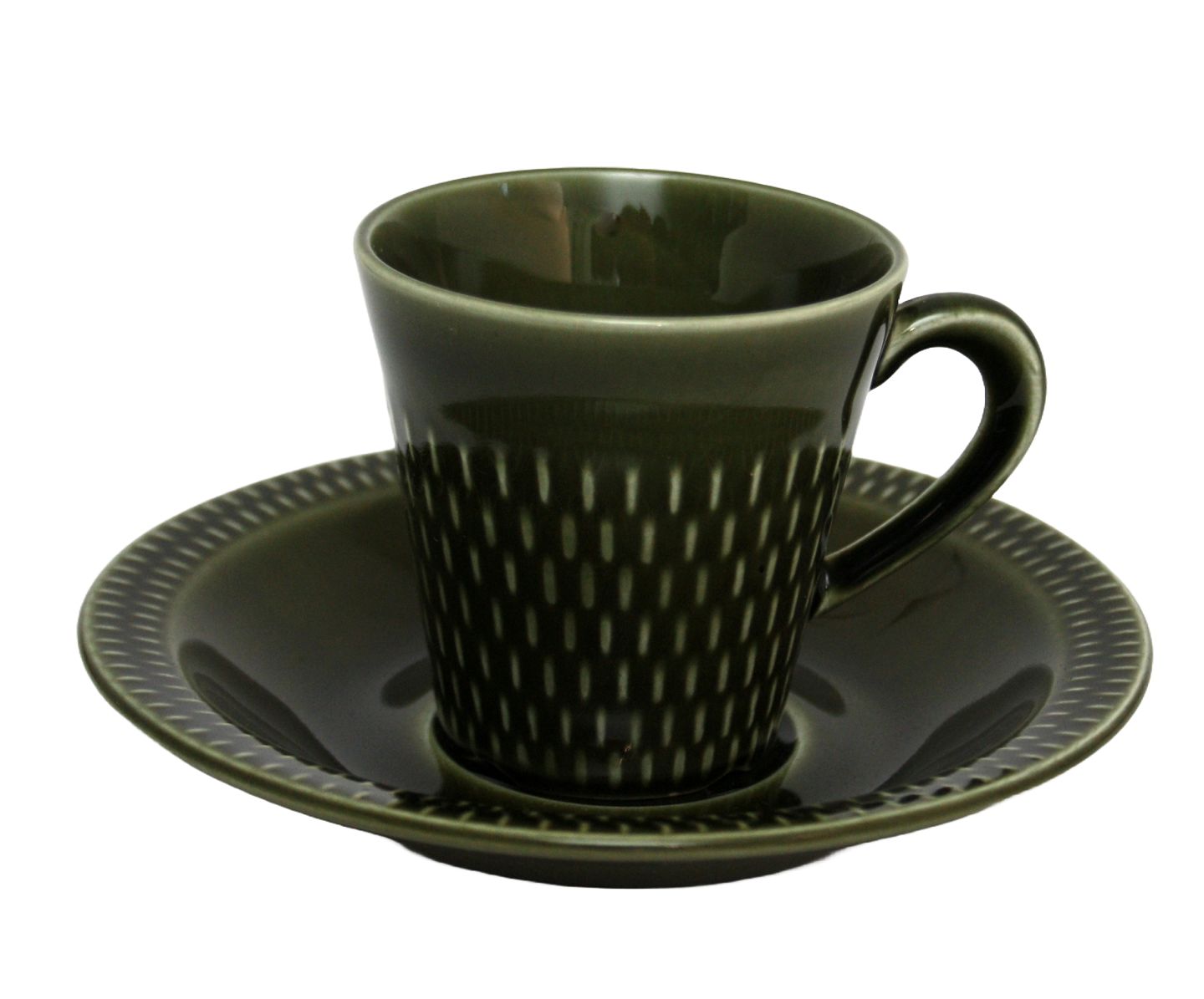 Text available in Danish: Stavangerflint, Norway, Grønnette, Grøn kop med underkop. Designet af Kåre B Fjeldsaa. Kop nr. 3030 Højde 7 cm. Øverste diameter 7 cm. Underkop diameter 14 cm. Pris: 75 kr. stk. Lager: 5