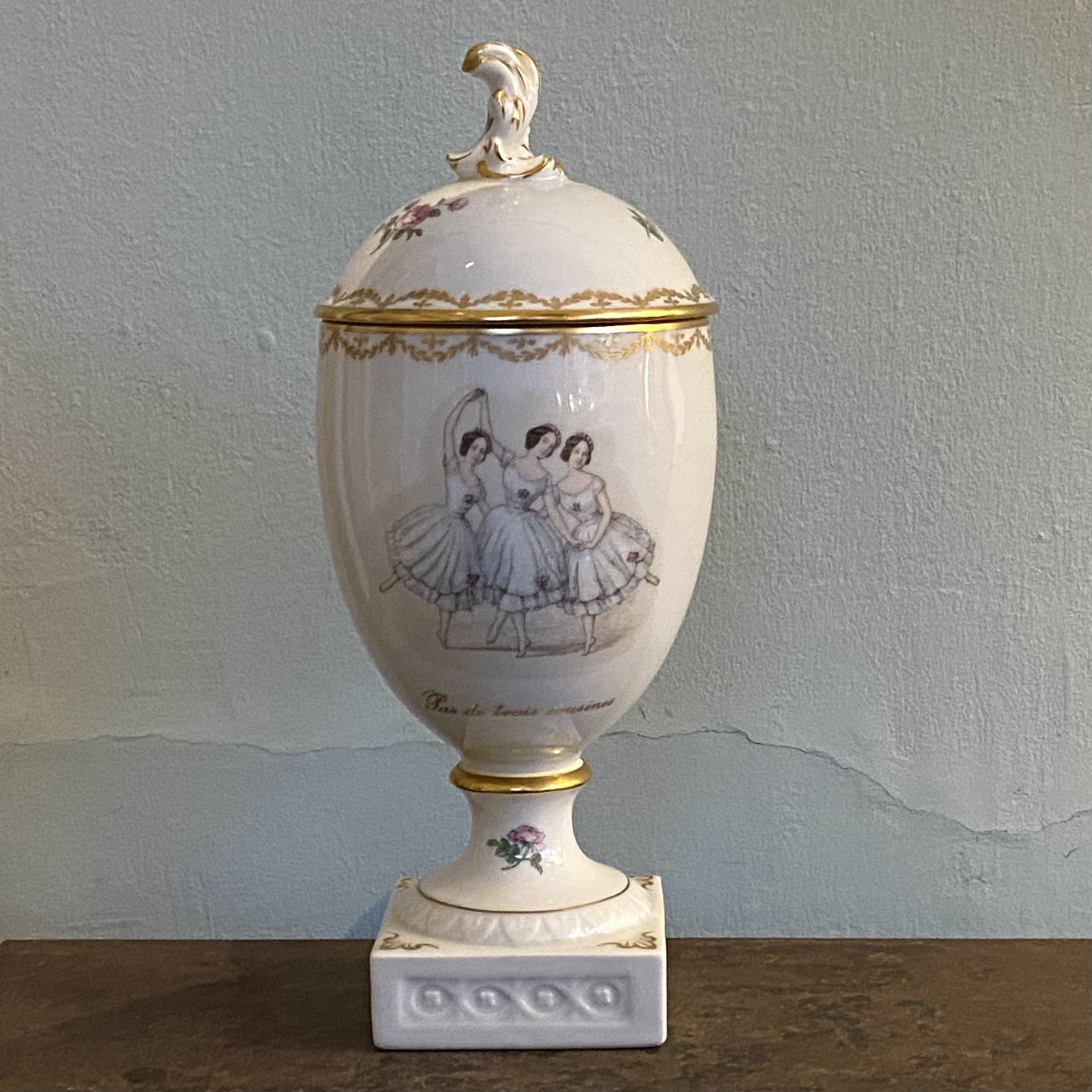 Royal Copenhagen vase made for the centenary of August Bournonville's death. Decorated with overglaze Opposite side with image from the ballet "Pas de trois Cousines" Sophie, Juliette and Amalie Price, after a drawing by Edvard Lehmann. The decoration was done by Finn Clausen.1. SortingH. 26 cm. D. 11 cm.