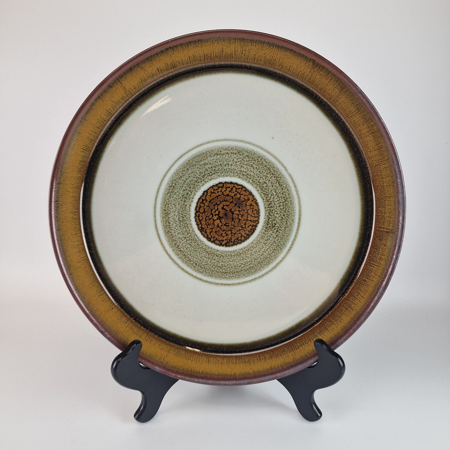 Diskos er af ovnfast stentøj. Stellet er gråt og håndmalet med brune og grønlige detaljer