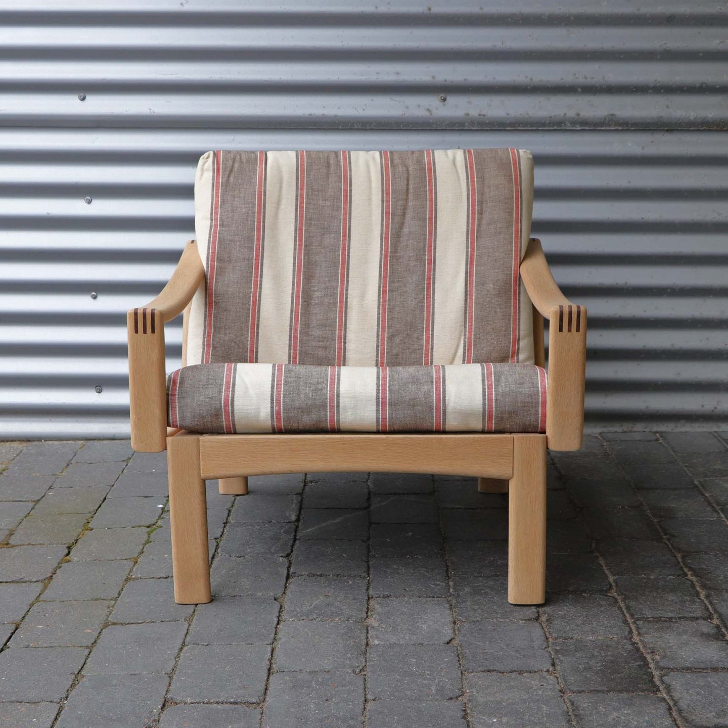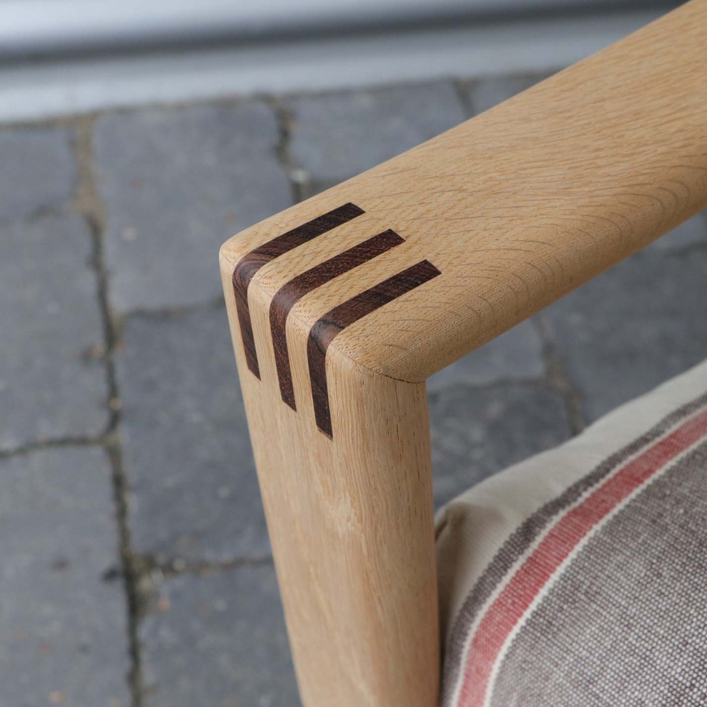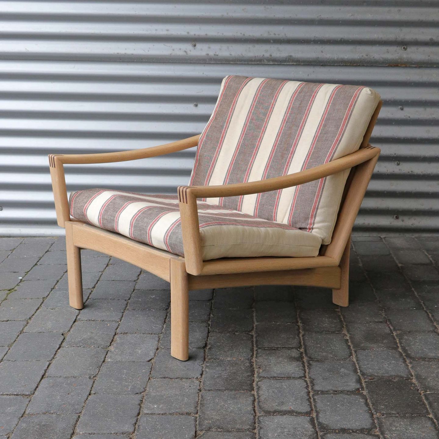 Lænestol i lyst egetræ. De løse hynder er betrukket med brun- og rødstibet linnedstof på råhvid baggrund