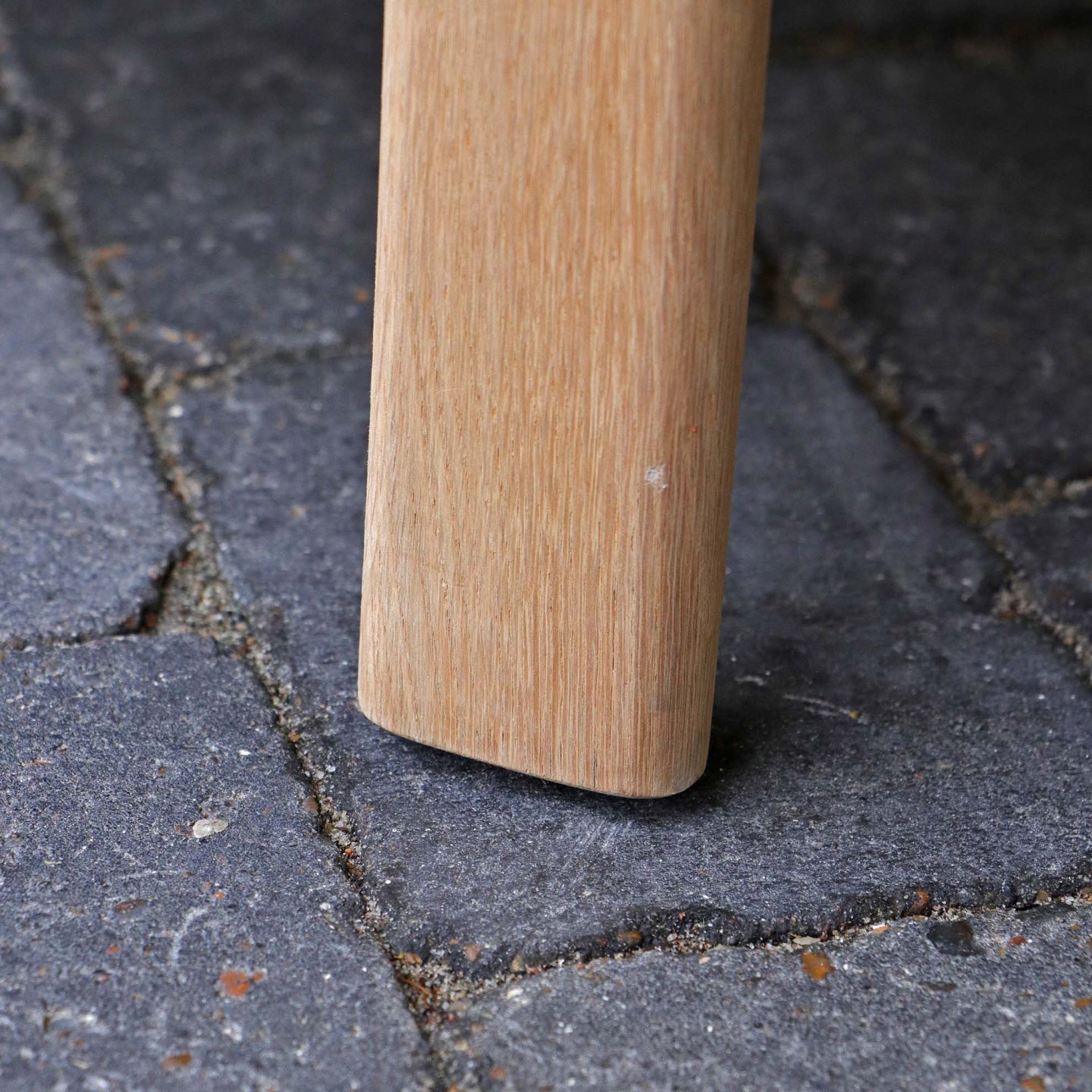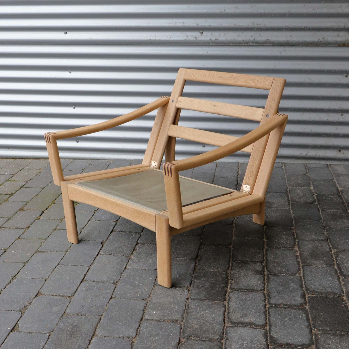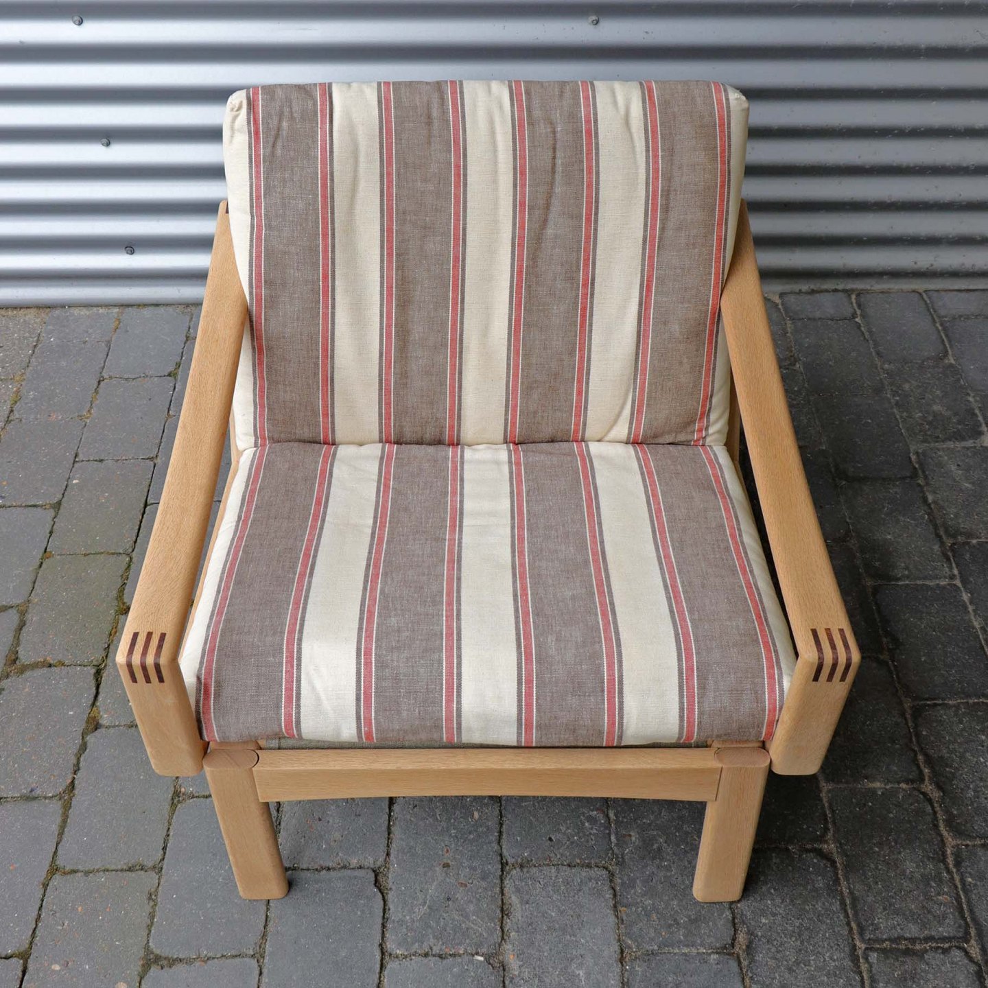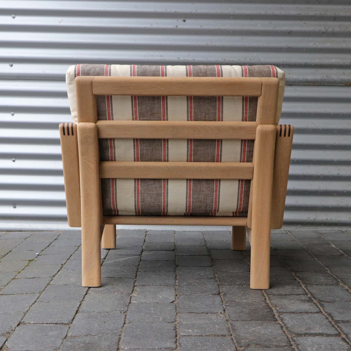 Lænestol i lyst egetræ. De løse hynder er betrukket med brun- og rødstibet linnedstof på råhvid baggrund