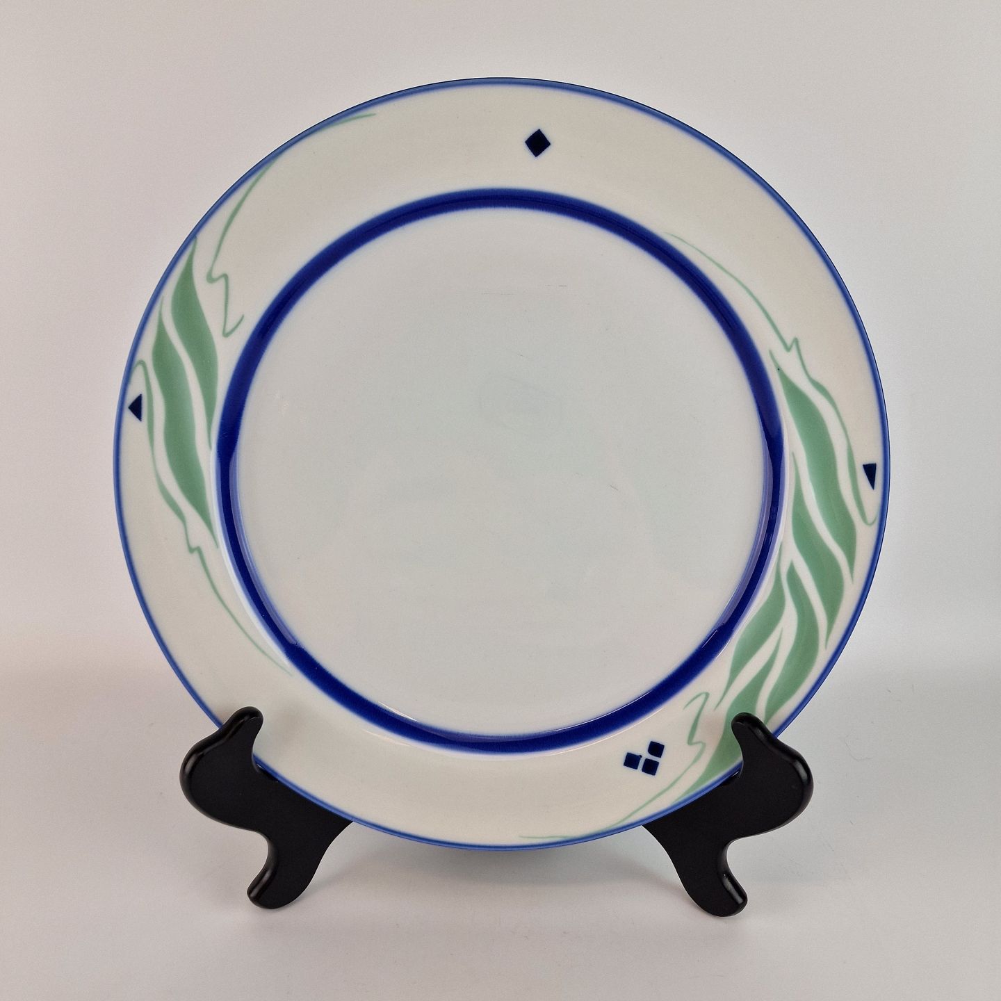 Springtime er af porcelæn, som er glaseret hvidt, malet med blå striber og abstrakt mønster i en lys grøn og blå farve.